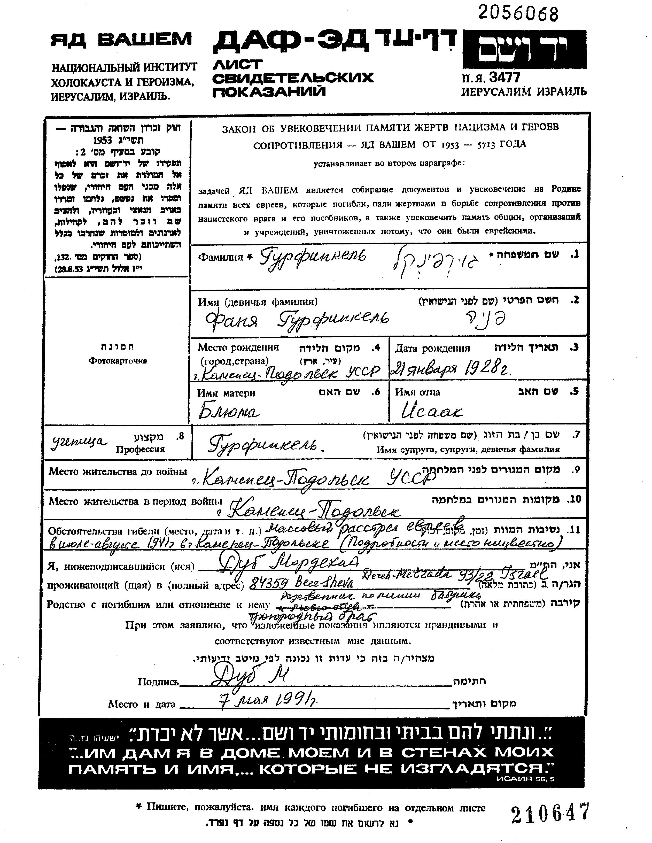 Gurfinkel Fania 1928 Kamenets Podolskiy, Ukraine (URSS) Feuille de témoignage