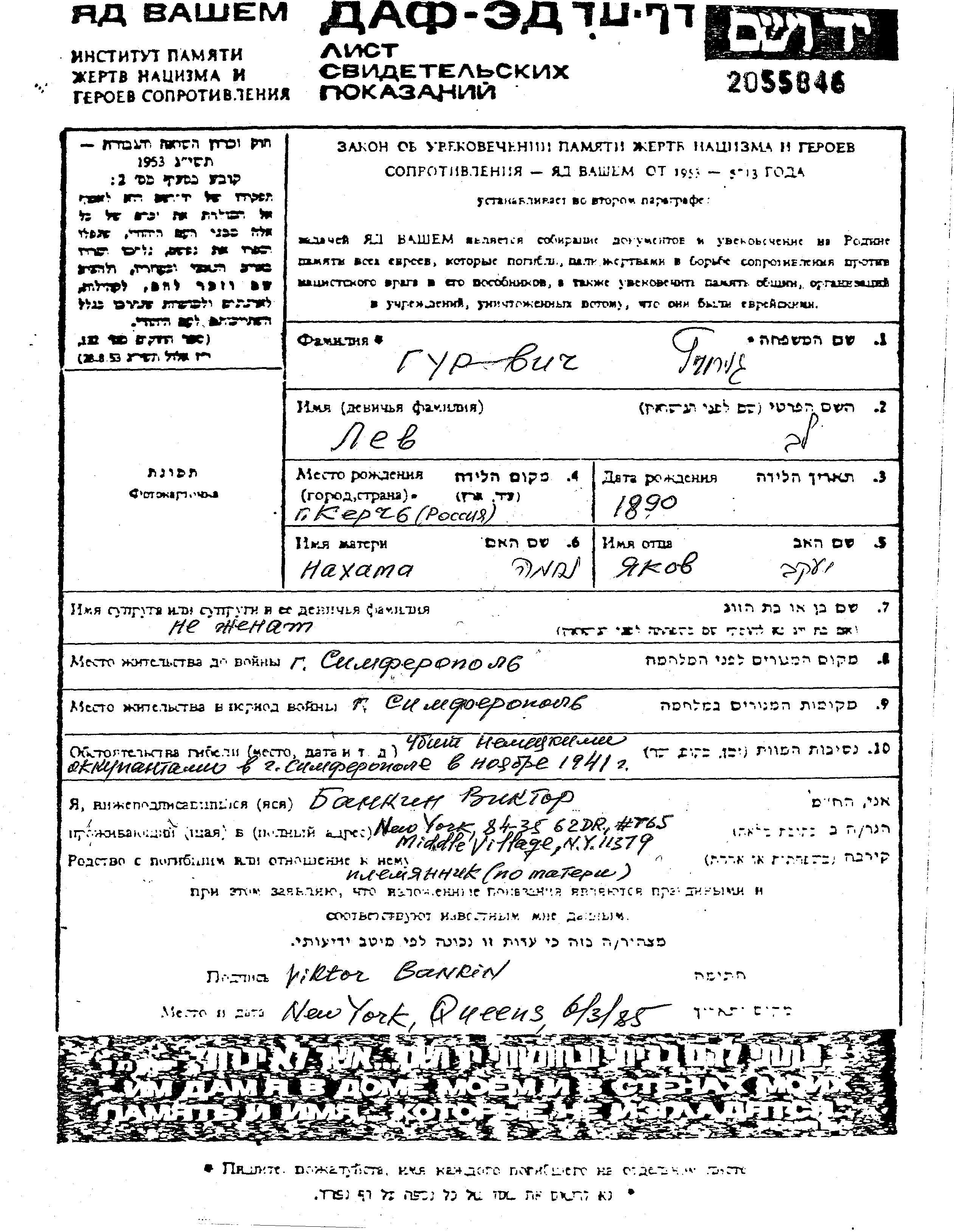 Gurvich Lev 1890 Simferopol, Russie (URSS) Feuille de témoignage
