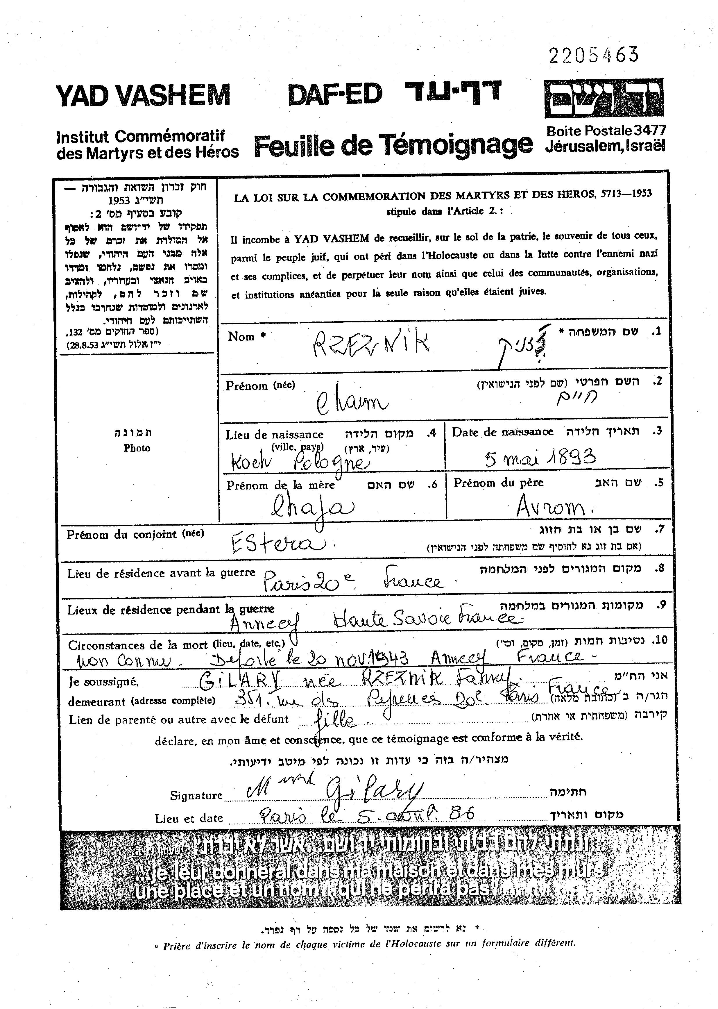 Reznik Khaim 1893 Paris, France Feuille de témoignage