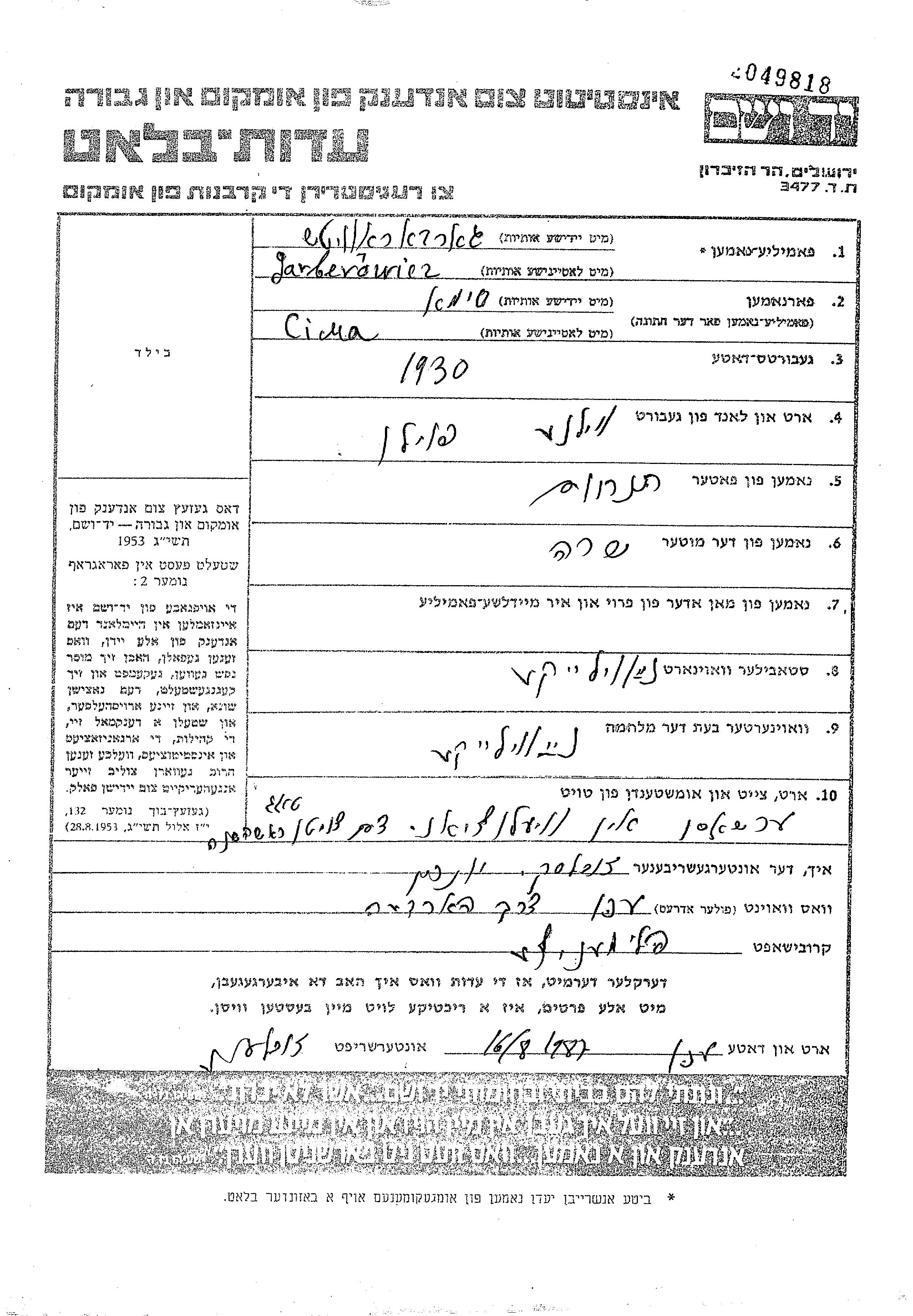 Garberowicz Cima 1930 Nowa Wilejka, Pologne Feuille de témoignage