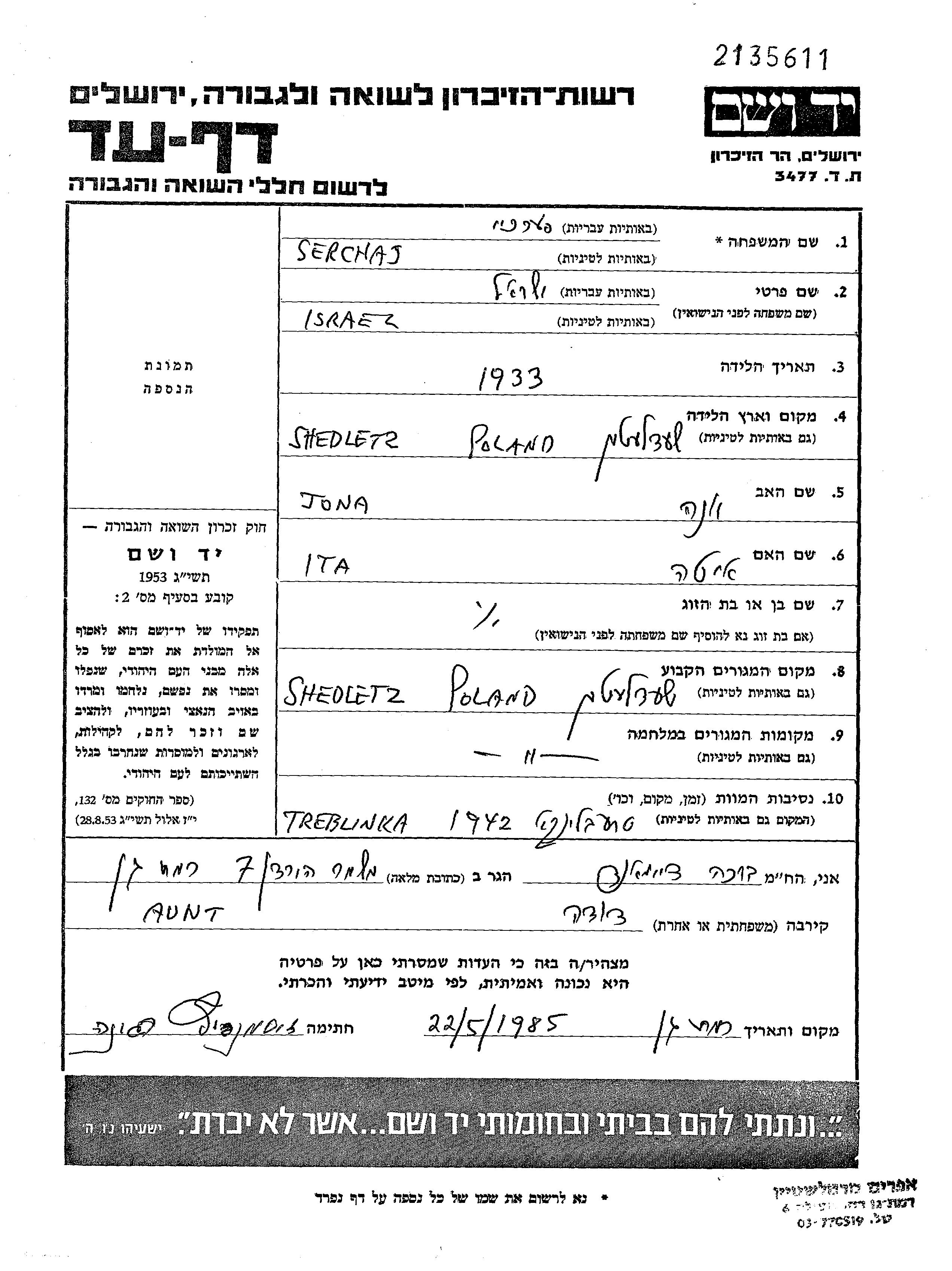 Israel Serchaj est né à Shedlitz, Pologne, fils de Jone et de Jita. Il était Enfant. Avant la seconde guerre mondiale il vivait à Shedlitz, Pologne. Au cours de la guerre, il était à Shedlitz, Pologne.