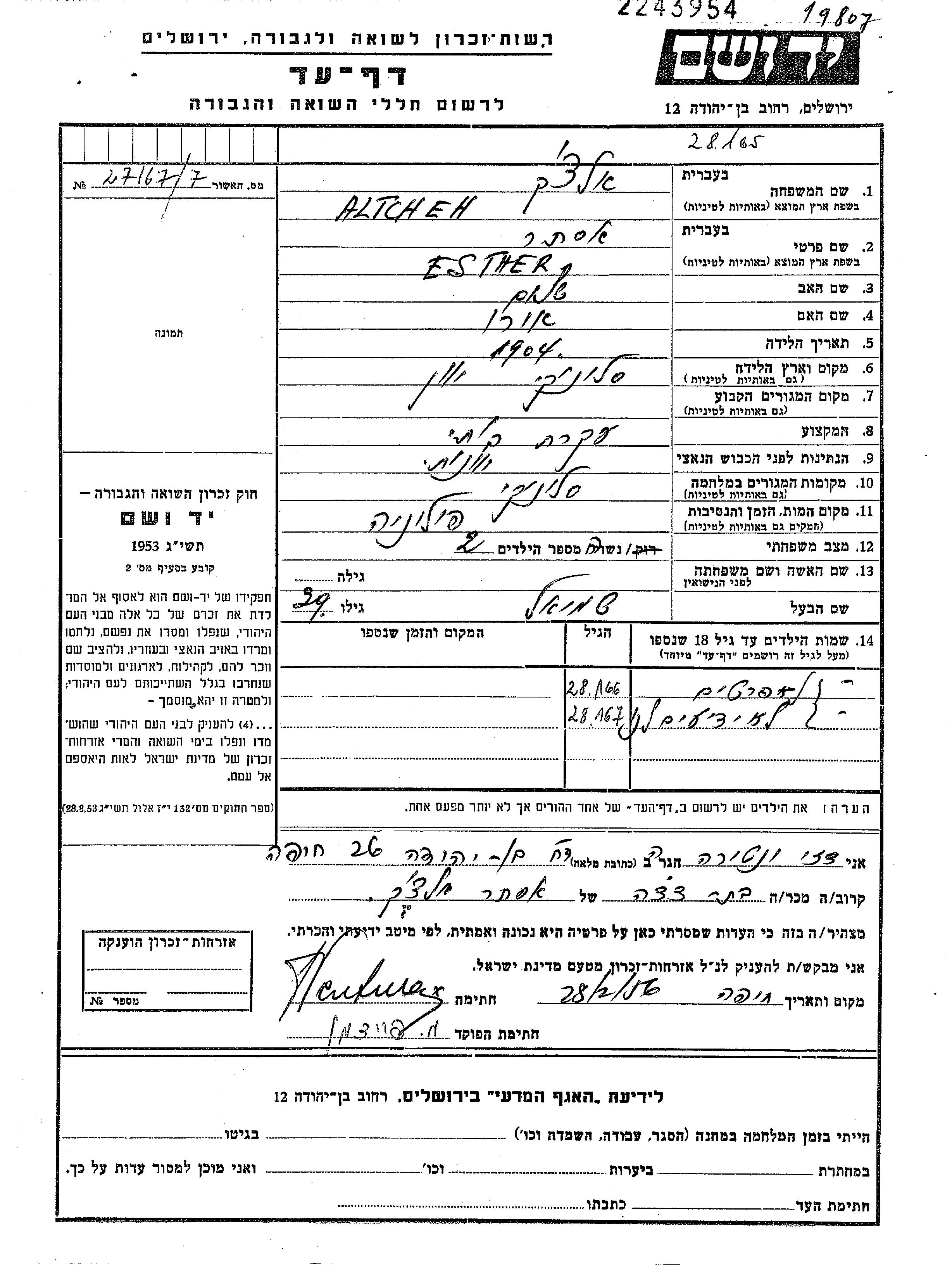 Altcheh Ester 1904 Saloniki, Grèce Feuille de témoignage