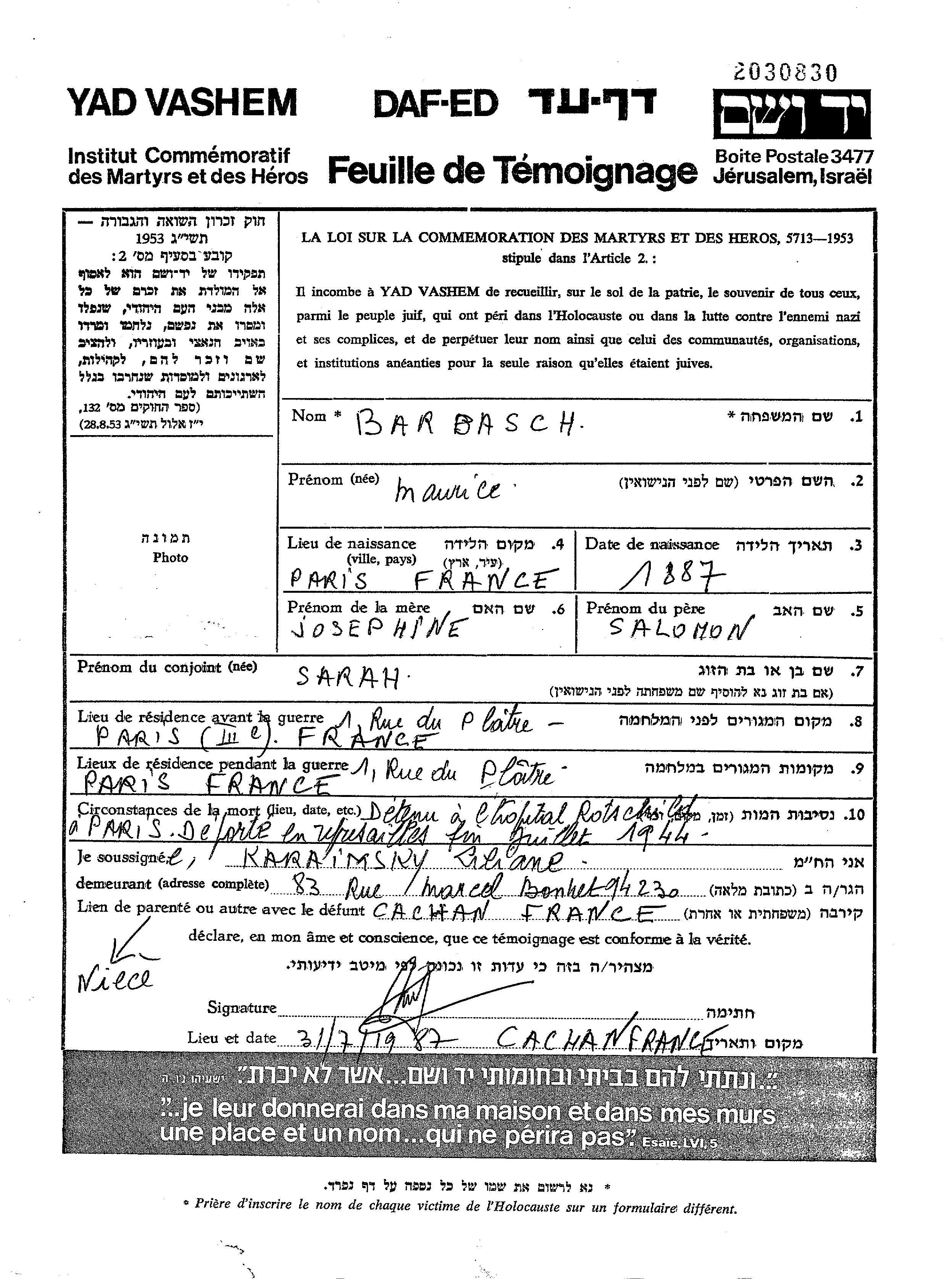Maurice Barbasch est né à Paris, France en 1887, fils de Salomon et de Josephine. Il était Mariée à Sarah. Avant la seconde guerre mondiale il vivait à Paris, France. Au cours de la guerre, il était à Paris, France.