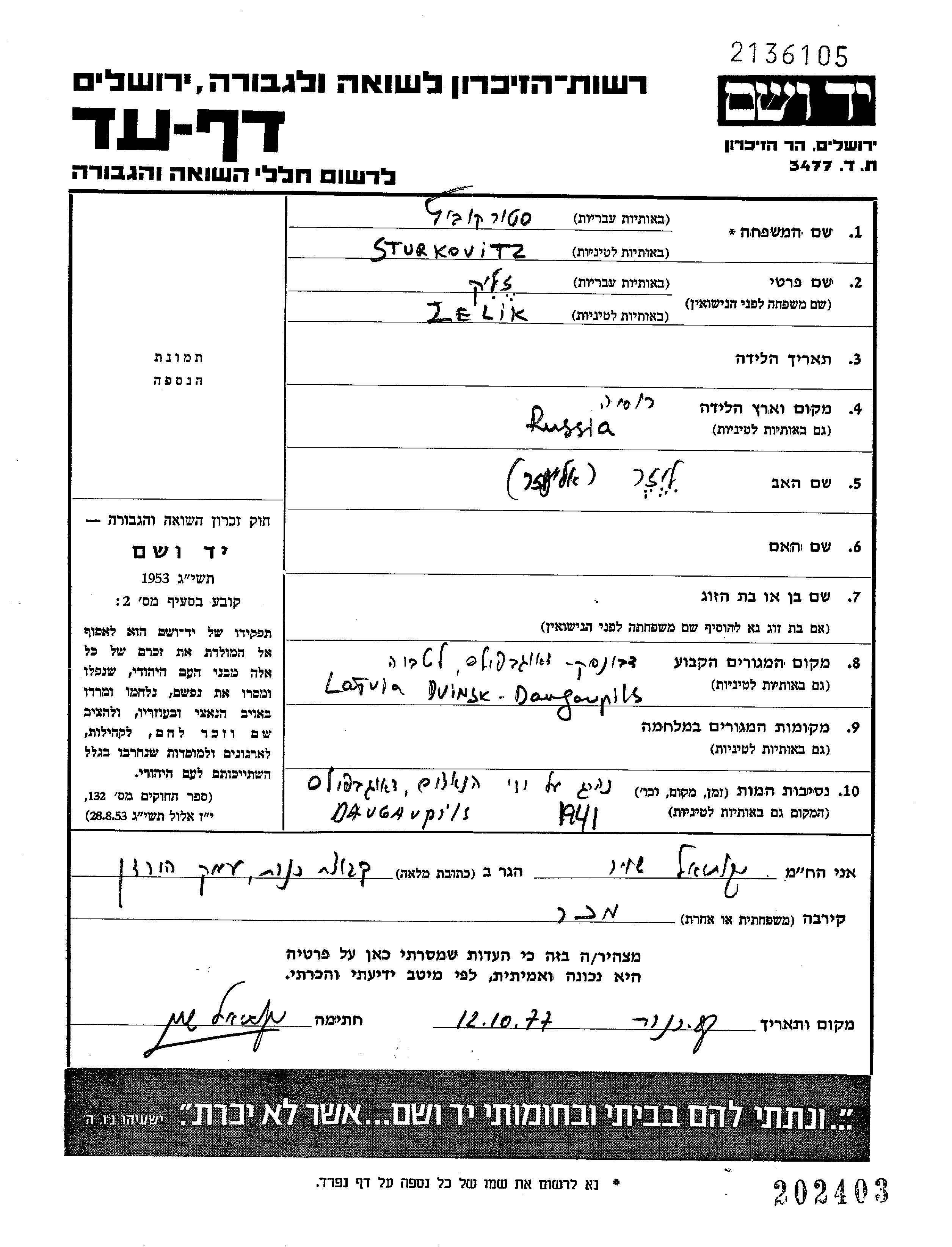 Sturkovitz Zelig Dvinsk, Lettonie Feuille de témoignage