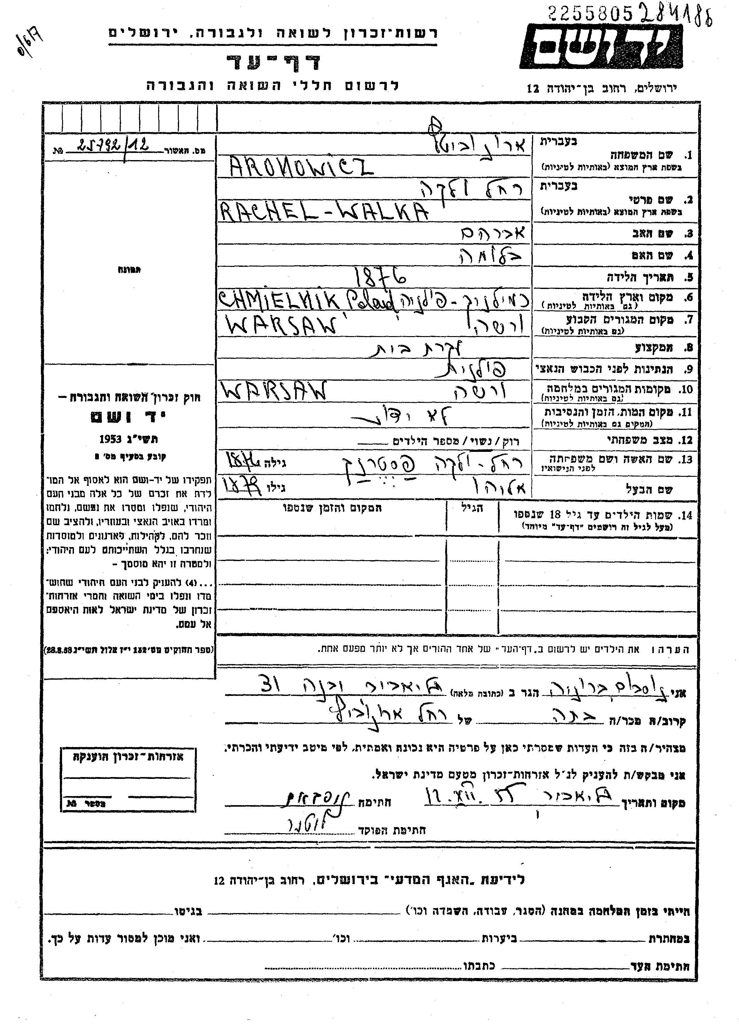 Aronowicz Rachel Walka Velka 1876 Warszawa, Pologne Feuille de témoignage