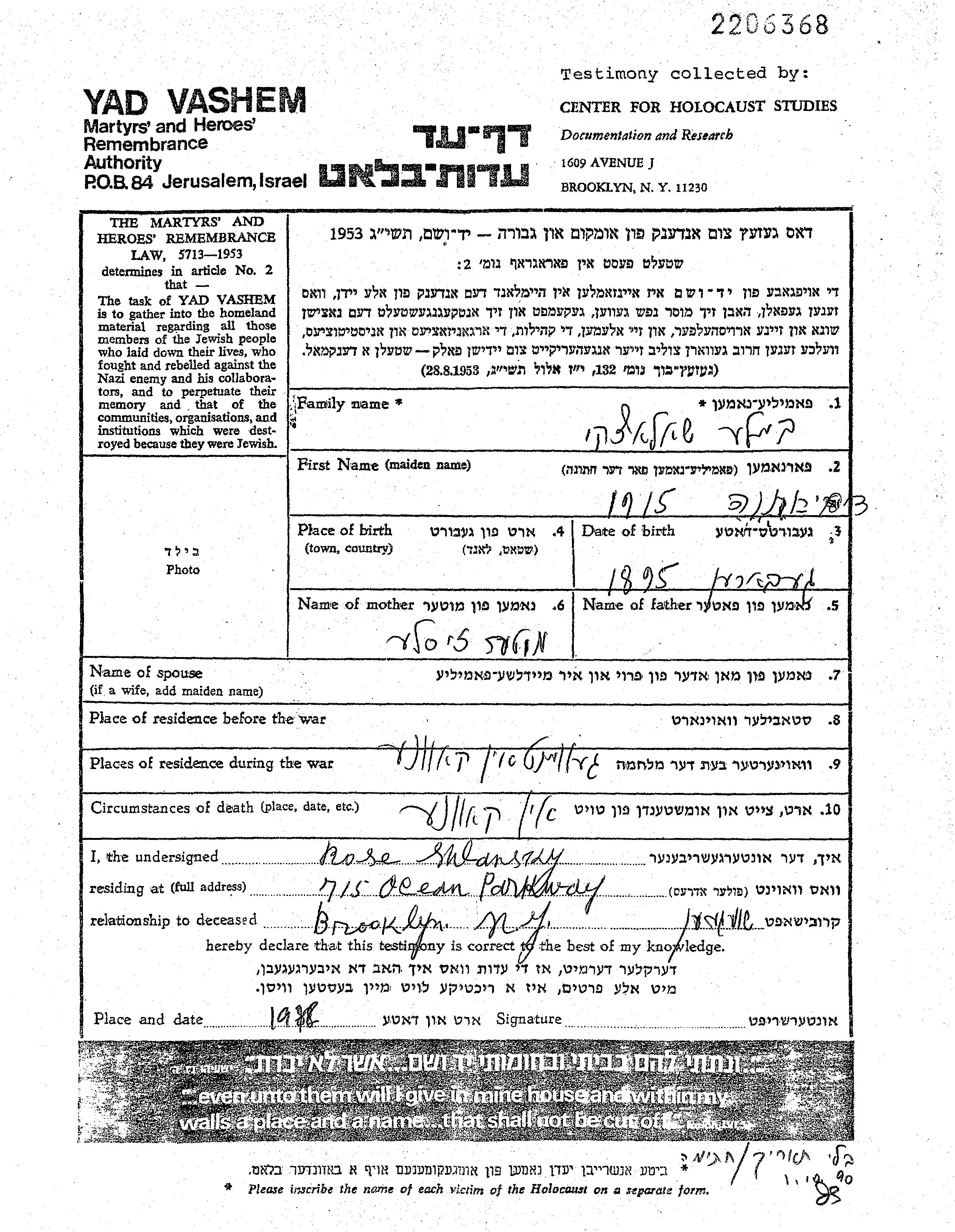 Yad Vashem - Pages of Testimony Names Memorial Collection