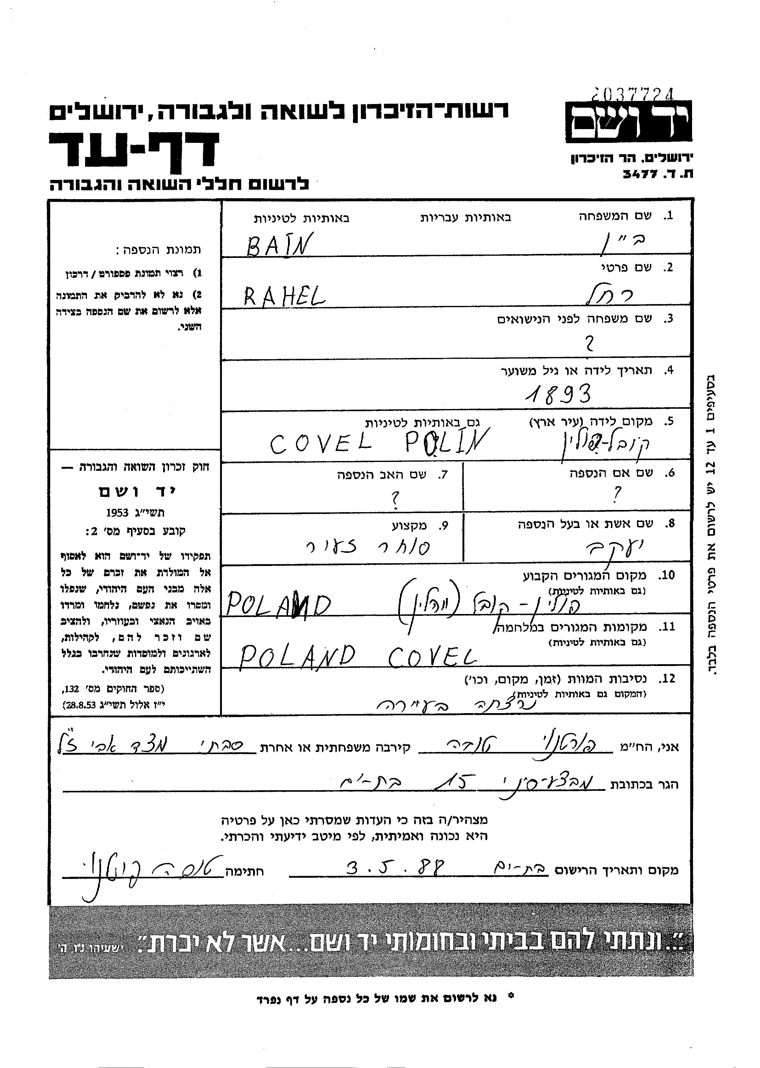 Rahel Bain est née à Kowel, Pologne en 1893. Elle était Commerçant/e et Mariée à Yakov. Avant la seconde guerre mondiale elle vivait à Kowel, Pologne. Pendant la guerre, elle était à Kowel, Pologne.