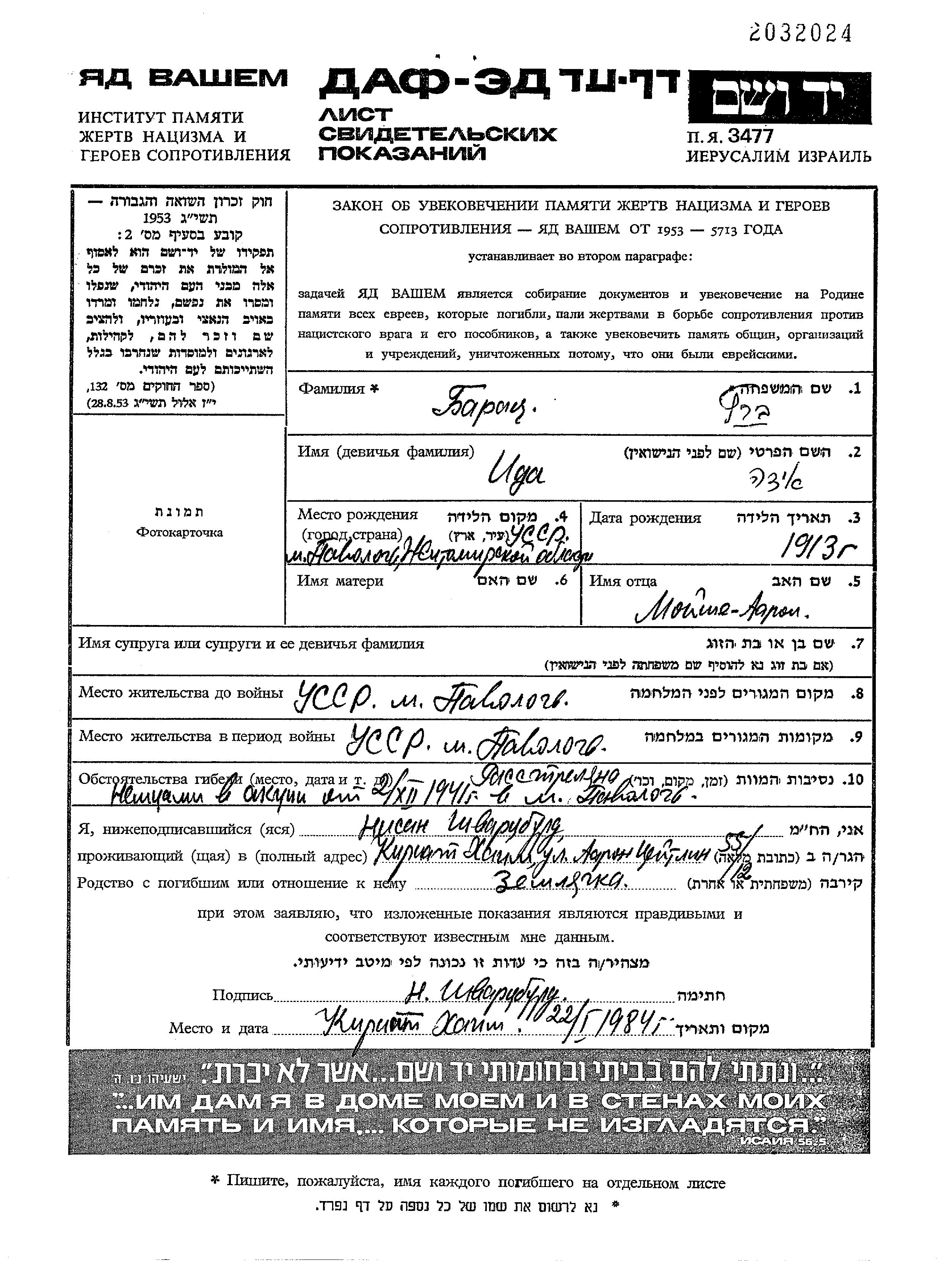 Baratz Ida 1913 Pavoloch, Ukraine (URSS) Feuille de témoignage