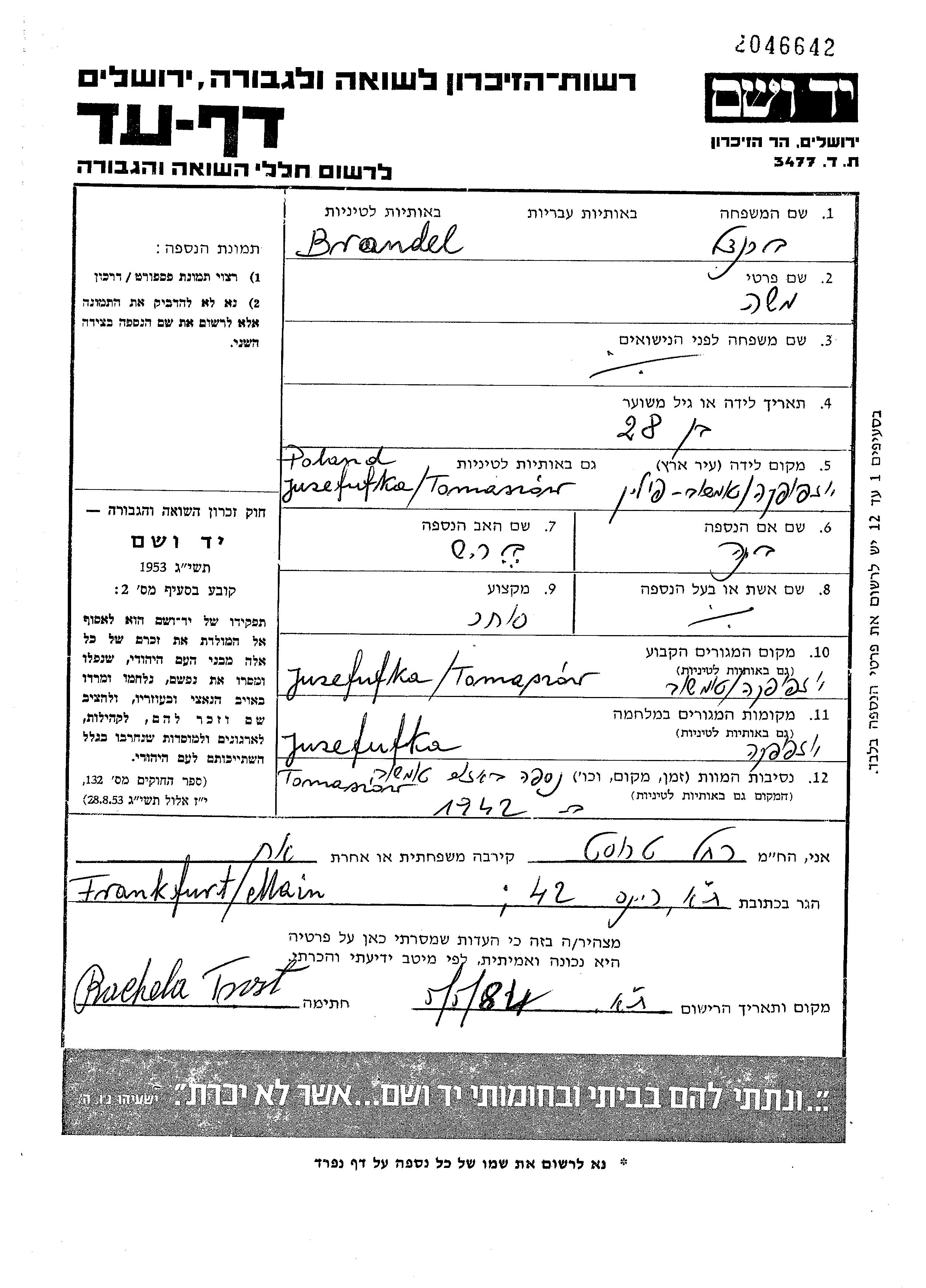Brandel Moshe Jozefowka, Pologne Feuille de témoignage