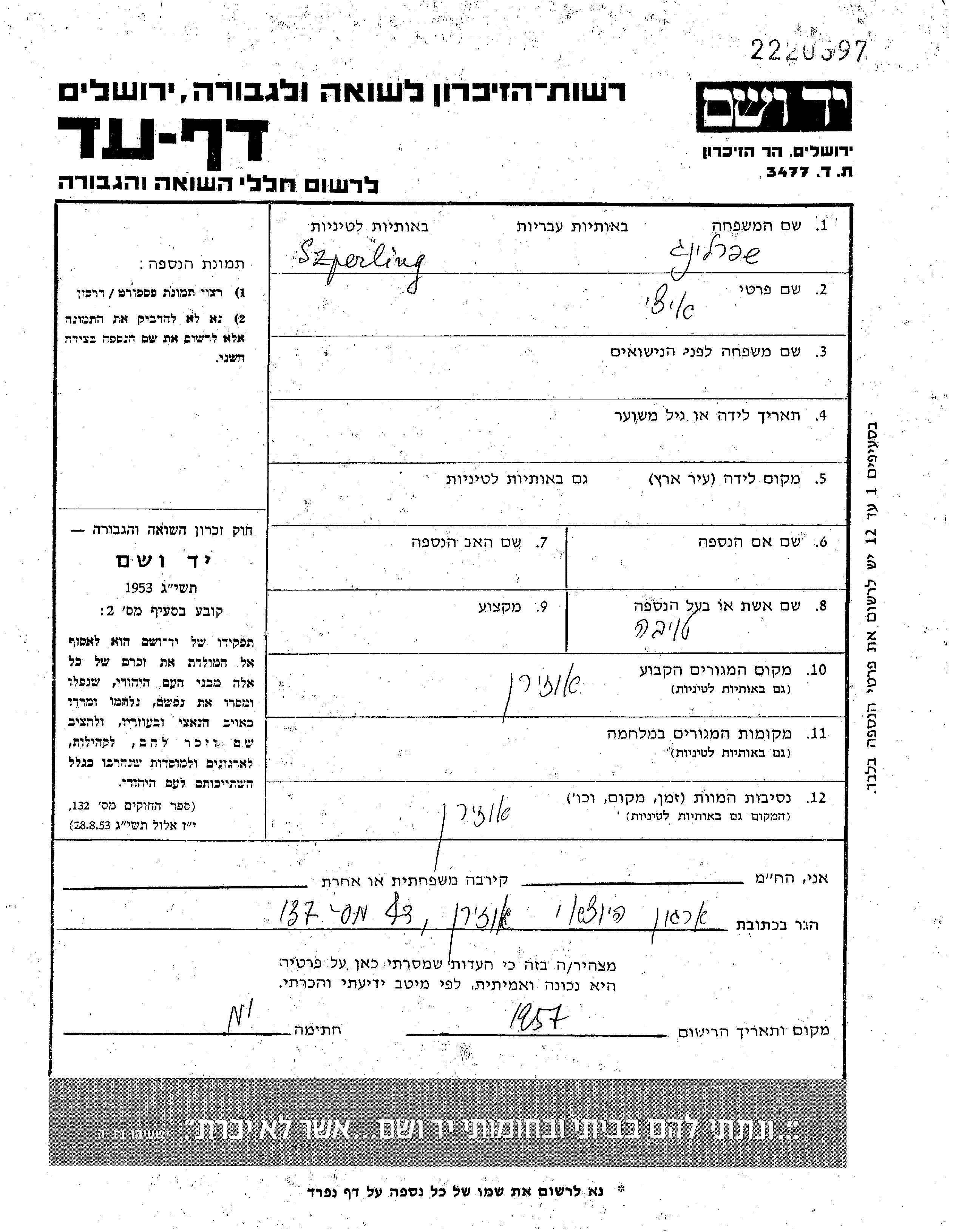 Szperling Iche Ozieran, Pologne Feuille de témoignage