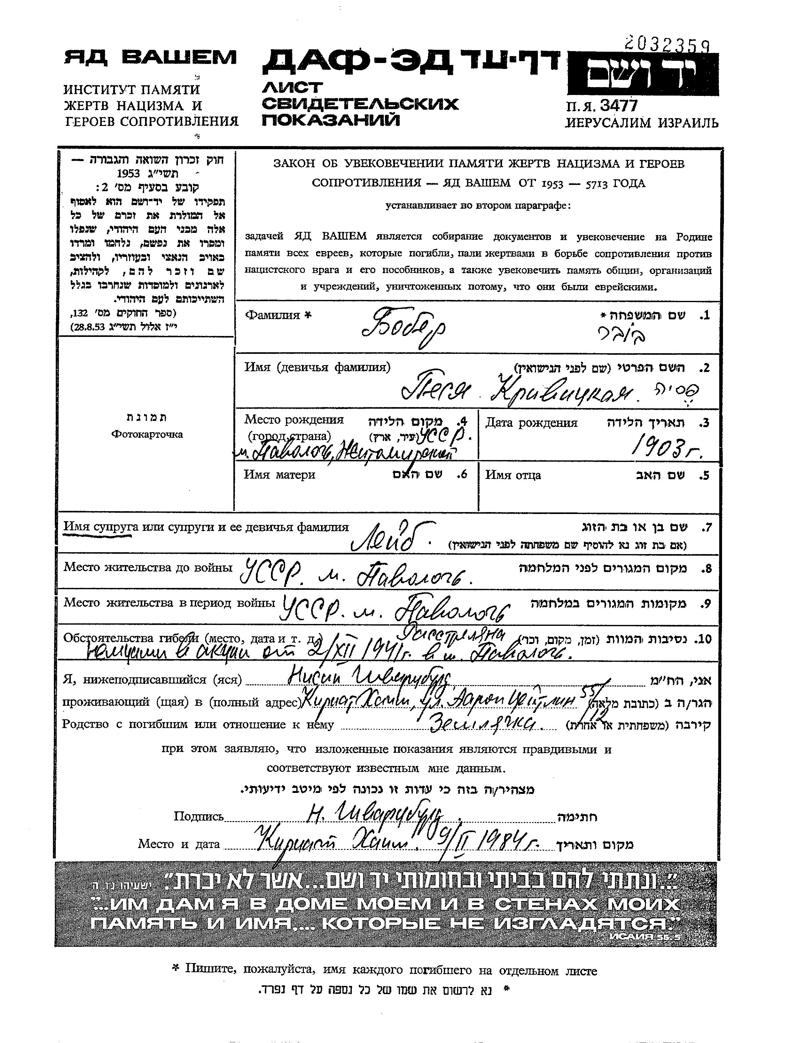 Bober Pesia 1903 Pavoloch, Ukraine (URSS) Feuille de témoignage