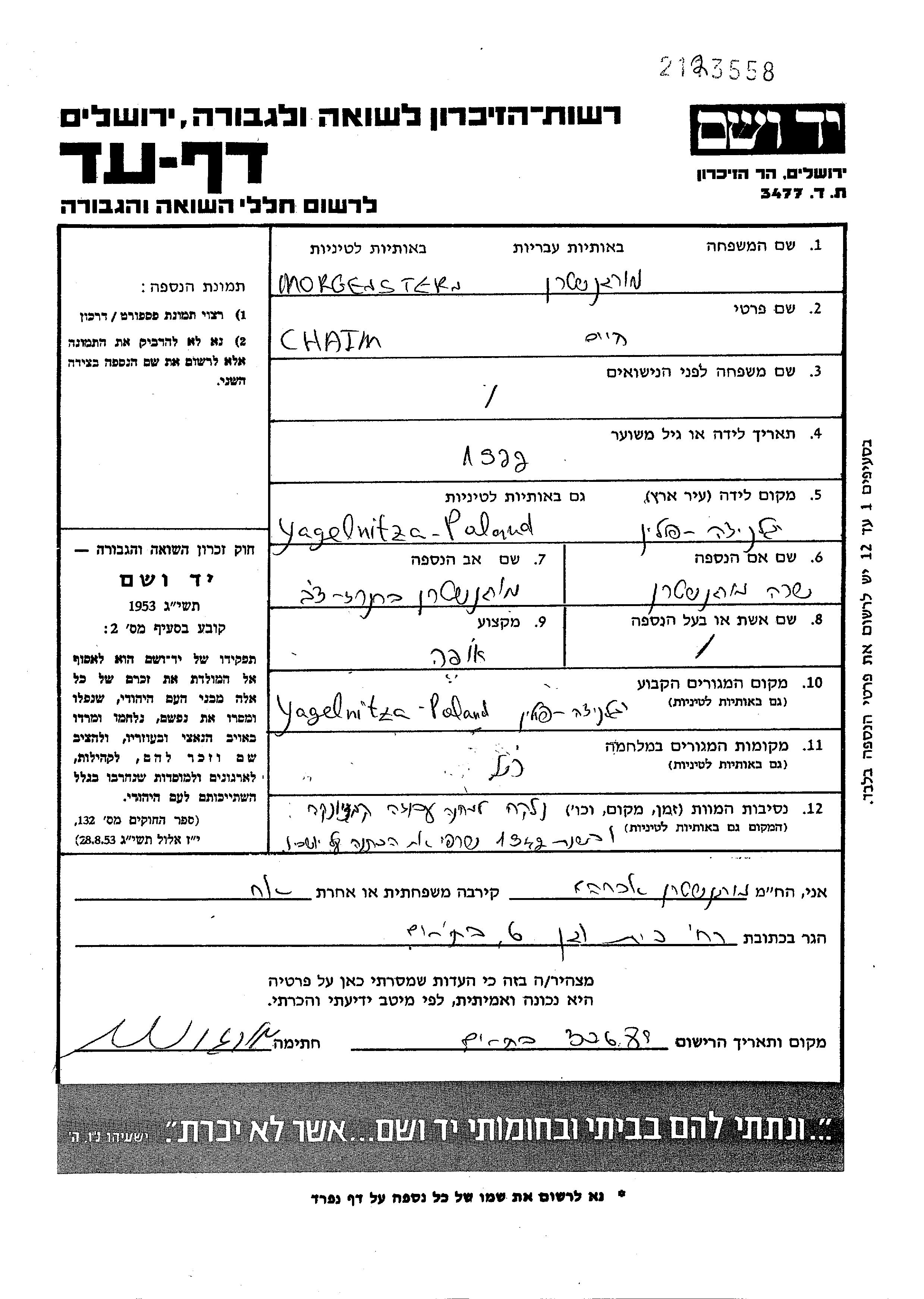 Morgenstern Chaim 1922 Jagielnica, Pologne Feuille de témoignage