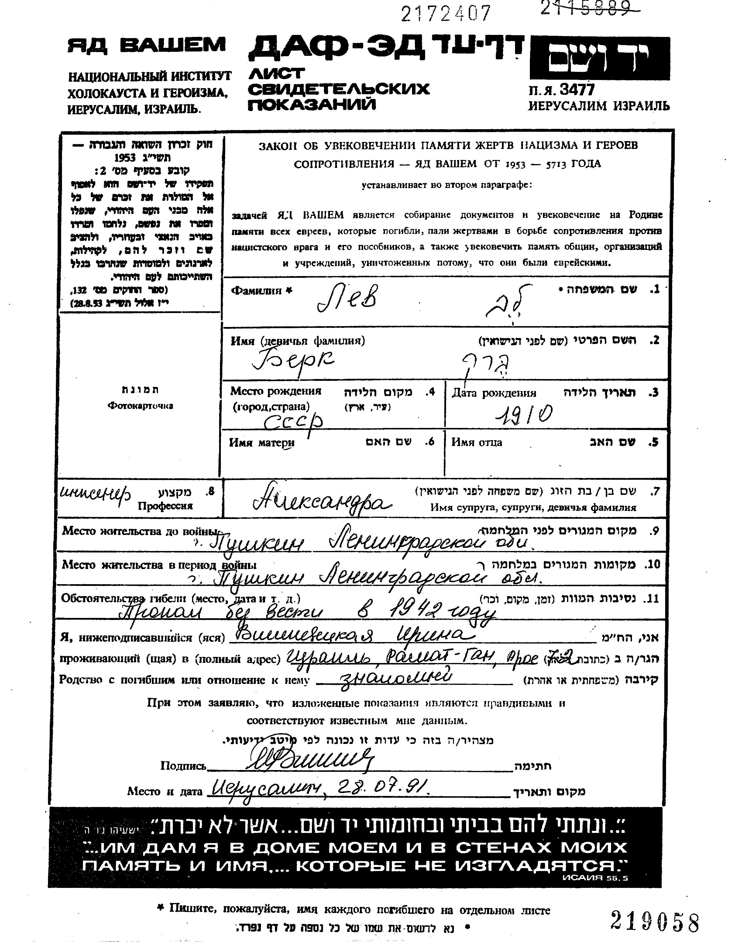 Yad Vashem - Pages of Testimony Names Memorial Collection