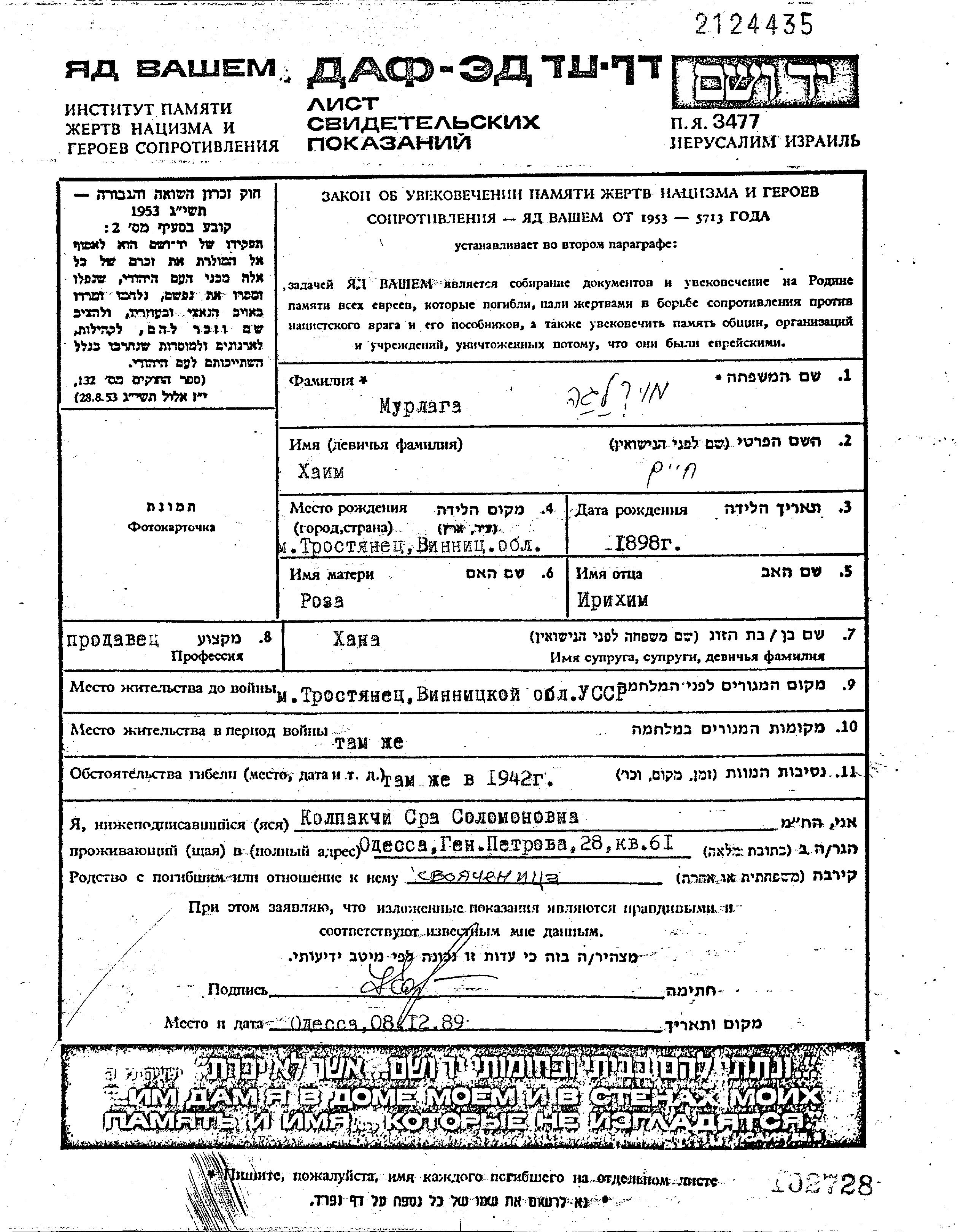 Murlaga Khaim 1898 Trostyanets, Ukraine (URSS) Feuille de témoignage