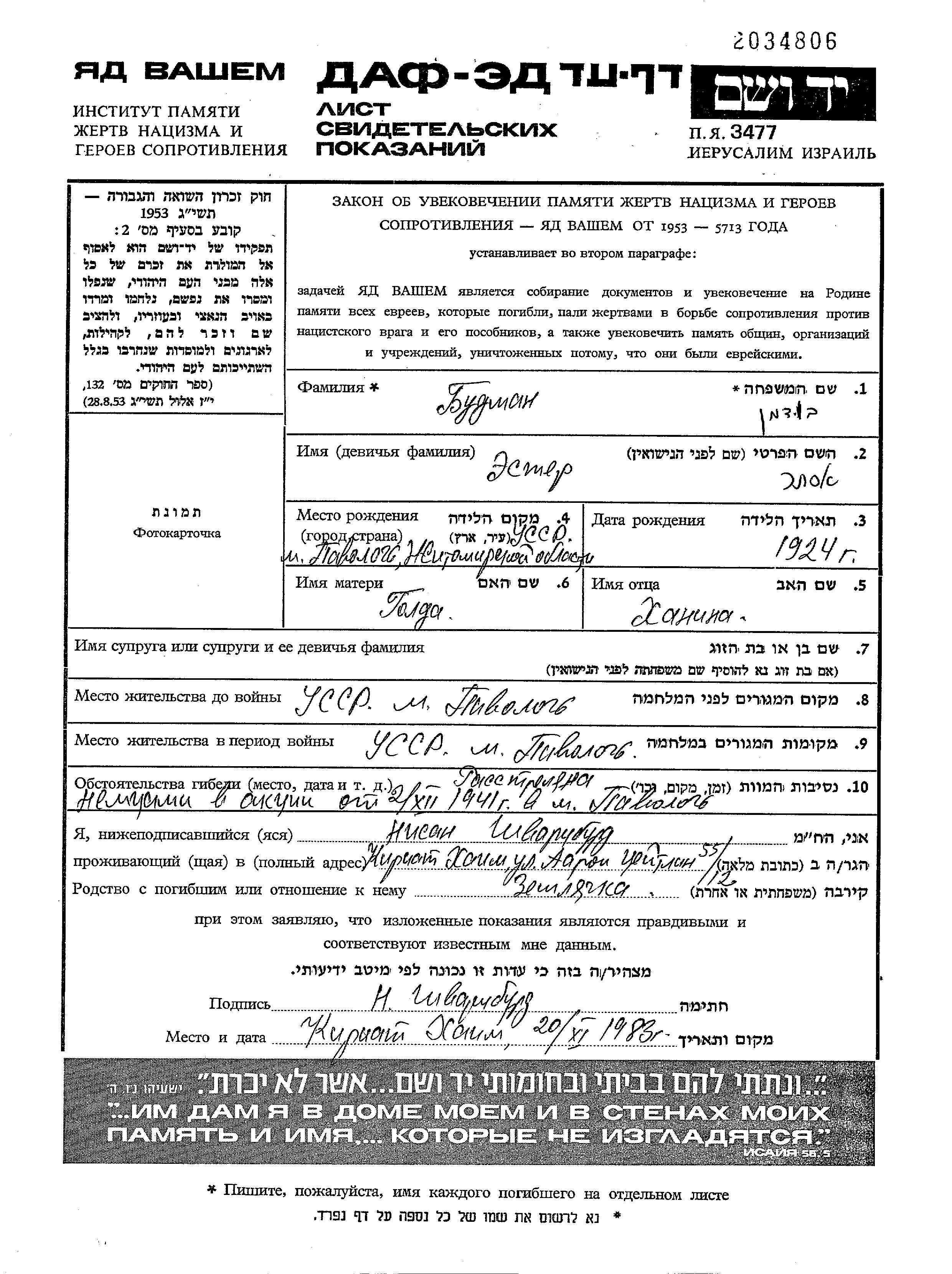 Budman Ester 1924 Pavoloch, Ukraine (URSS) Feuille de témoignage