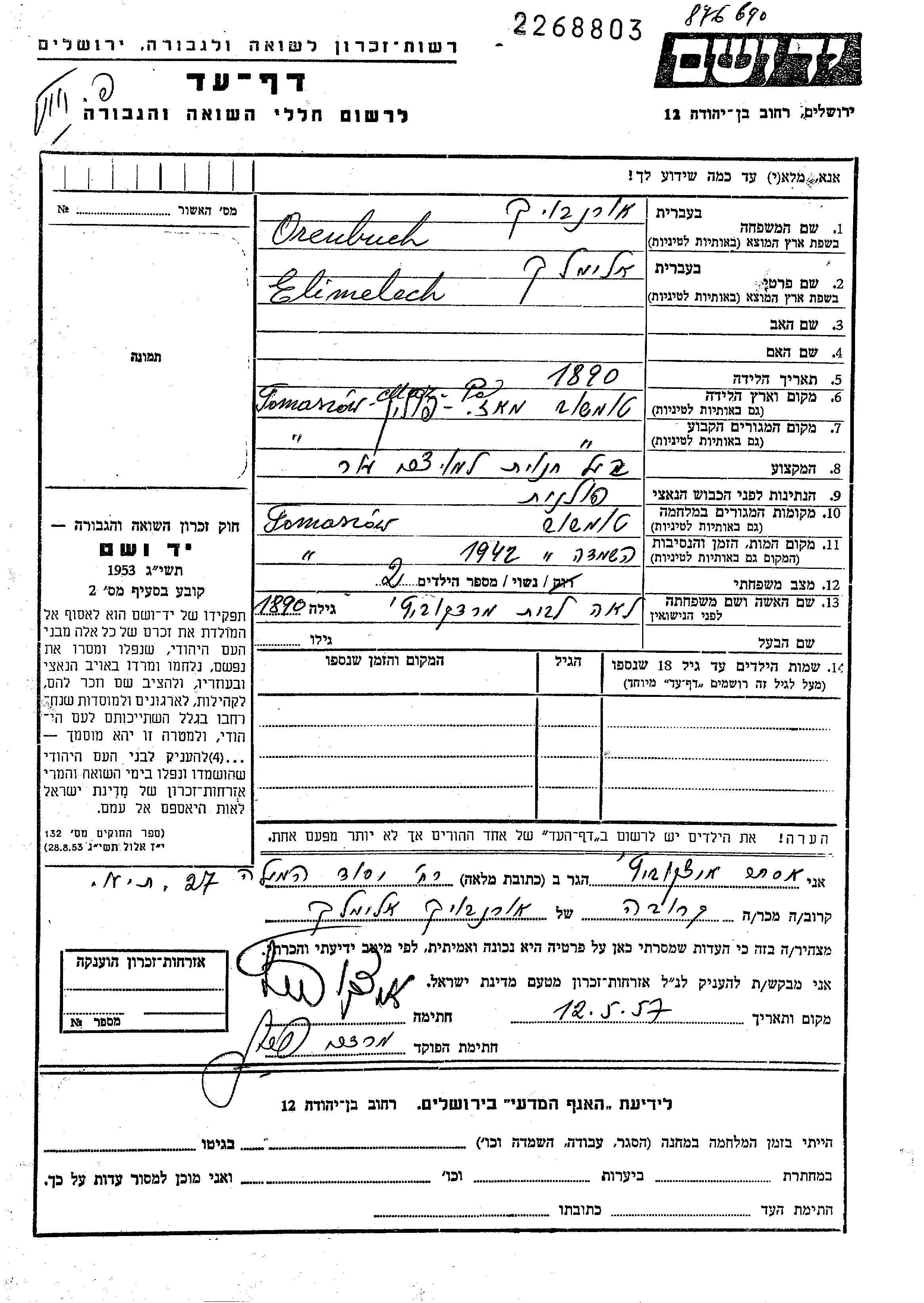 Orenbuch Elimelech 1890 Tomaszow Mazowieckie, Pologne Feuille de témoignage