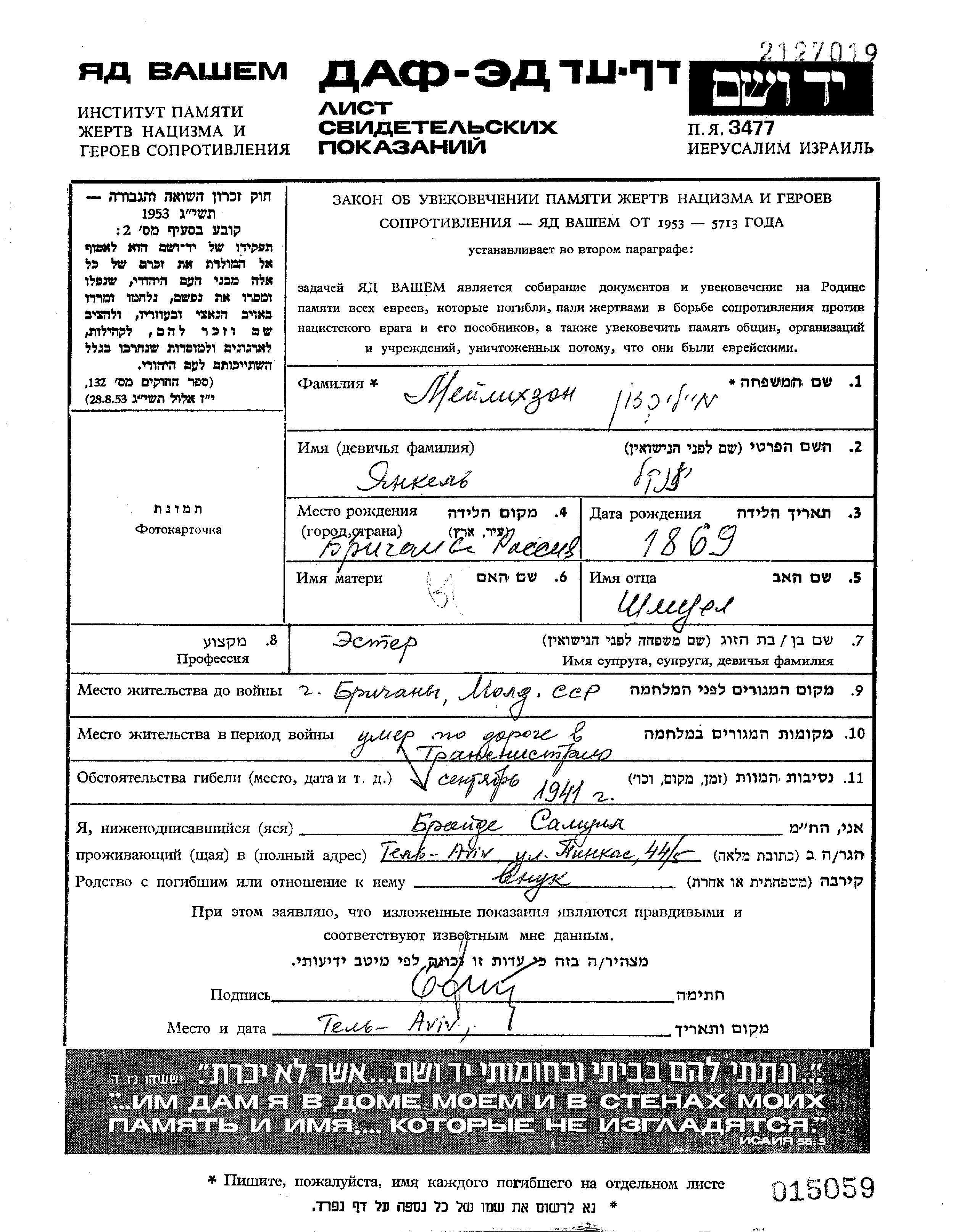 Meilikhzon Yankel 1869 Briceni, Roumanie Feuille de témoignage