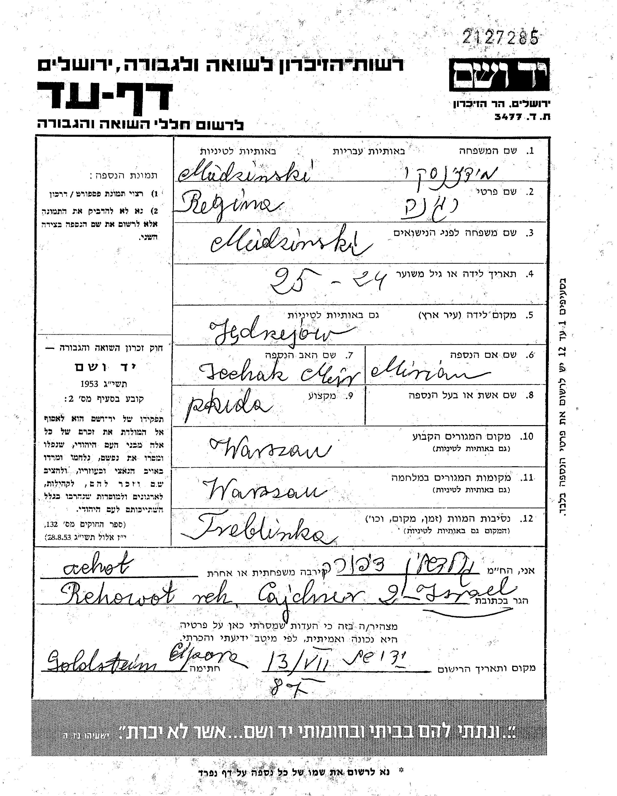 Miedzinski | Regina | Warszawa, Pologne | Feuille de témoignage | |
