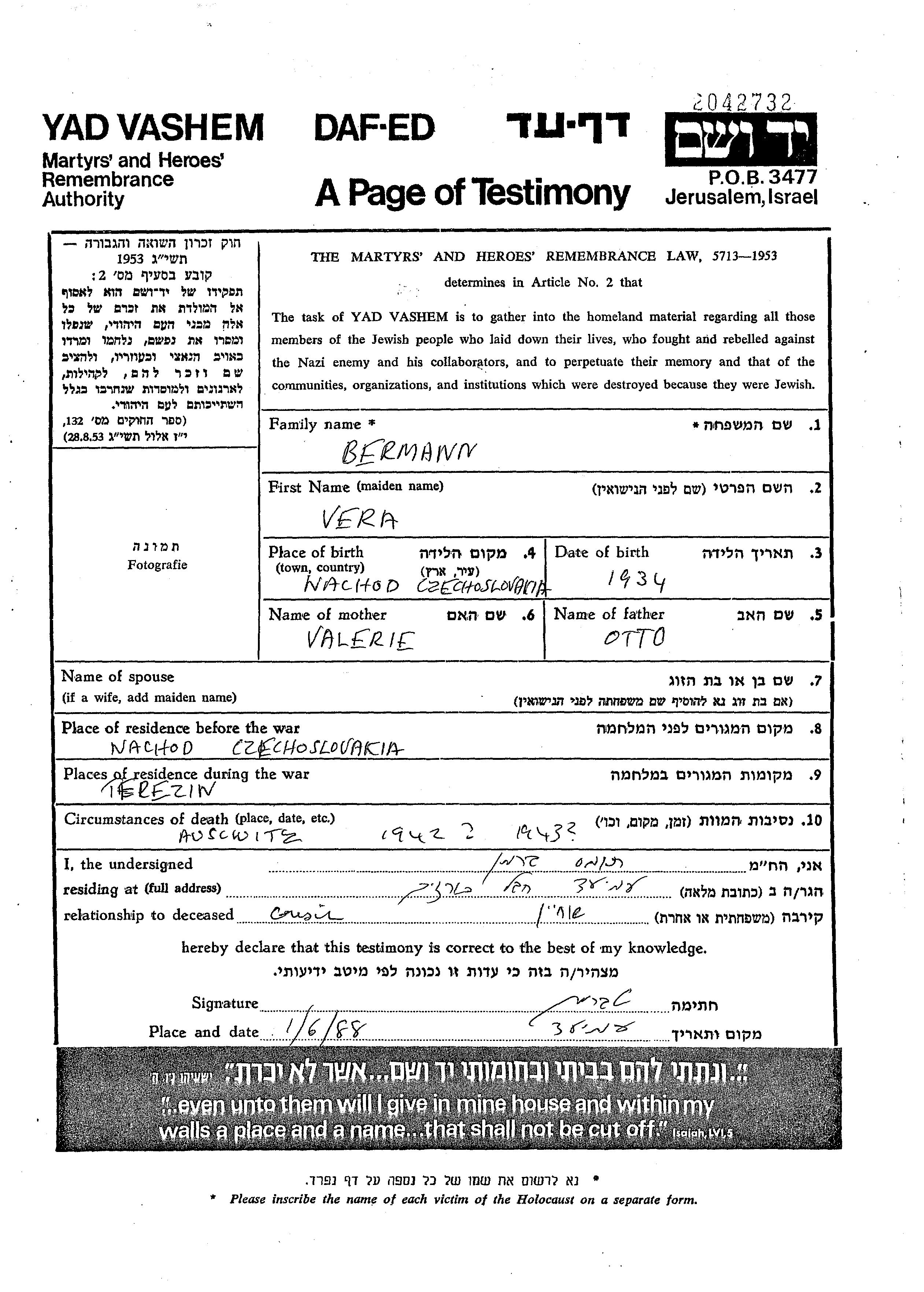 Bermann Vera 1934 Nachod, Tchécoslovaquie Feuille de témoignage