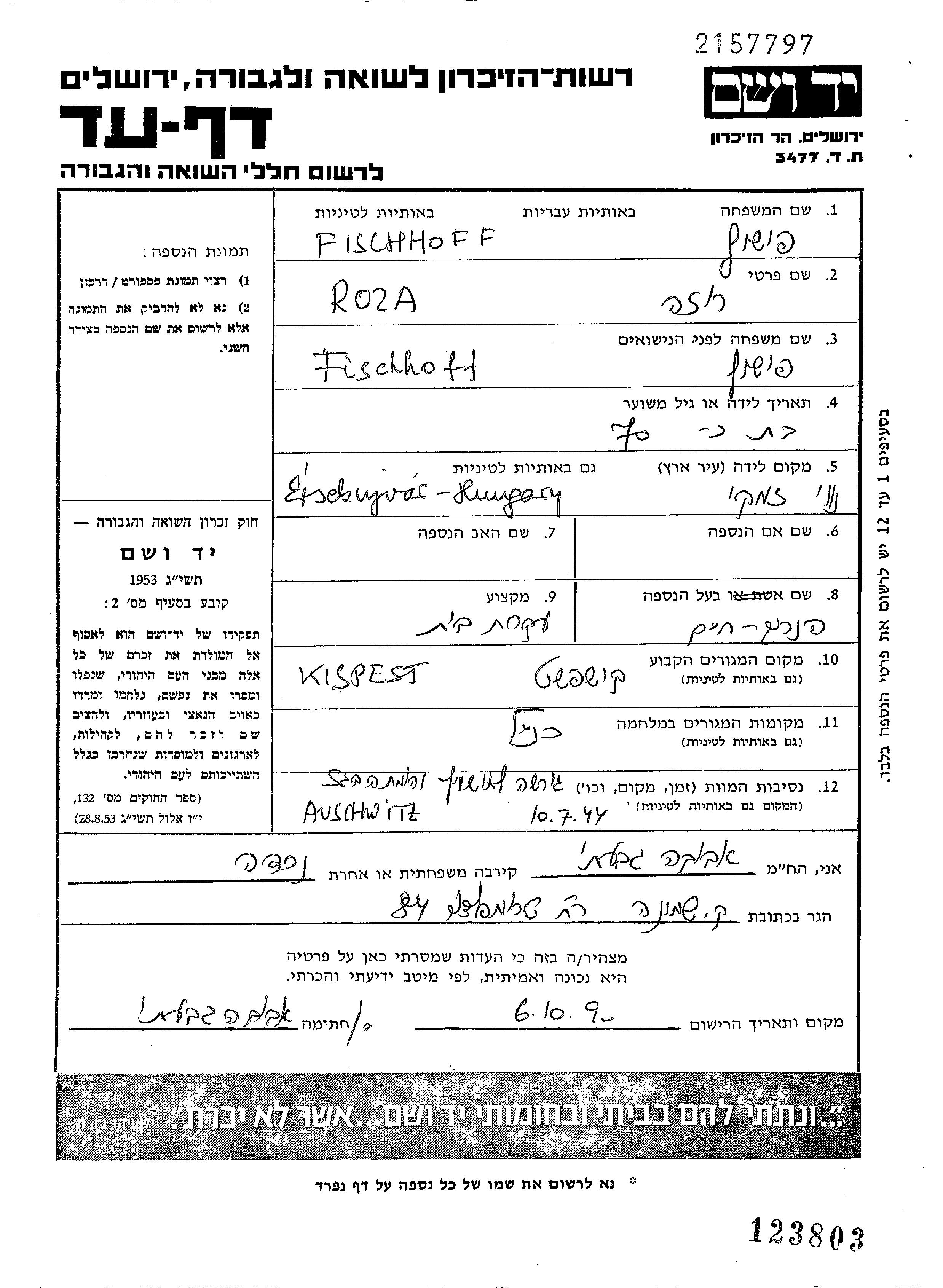 Fischhoff Roza 1874 Kispest, Hongrie Feuille de témoignage