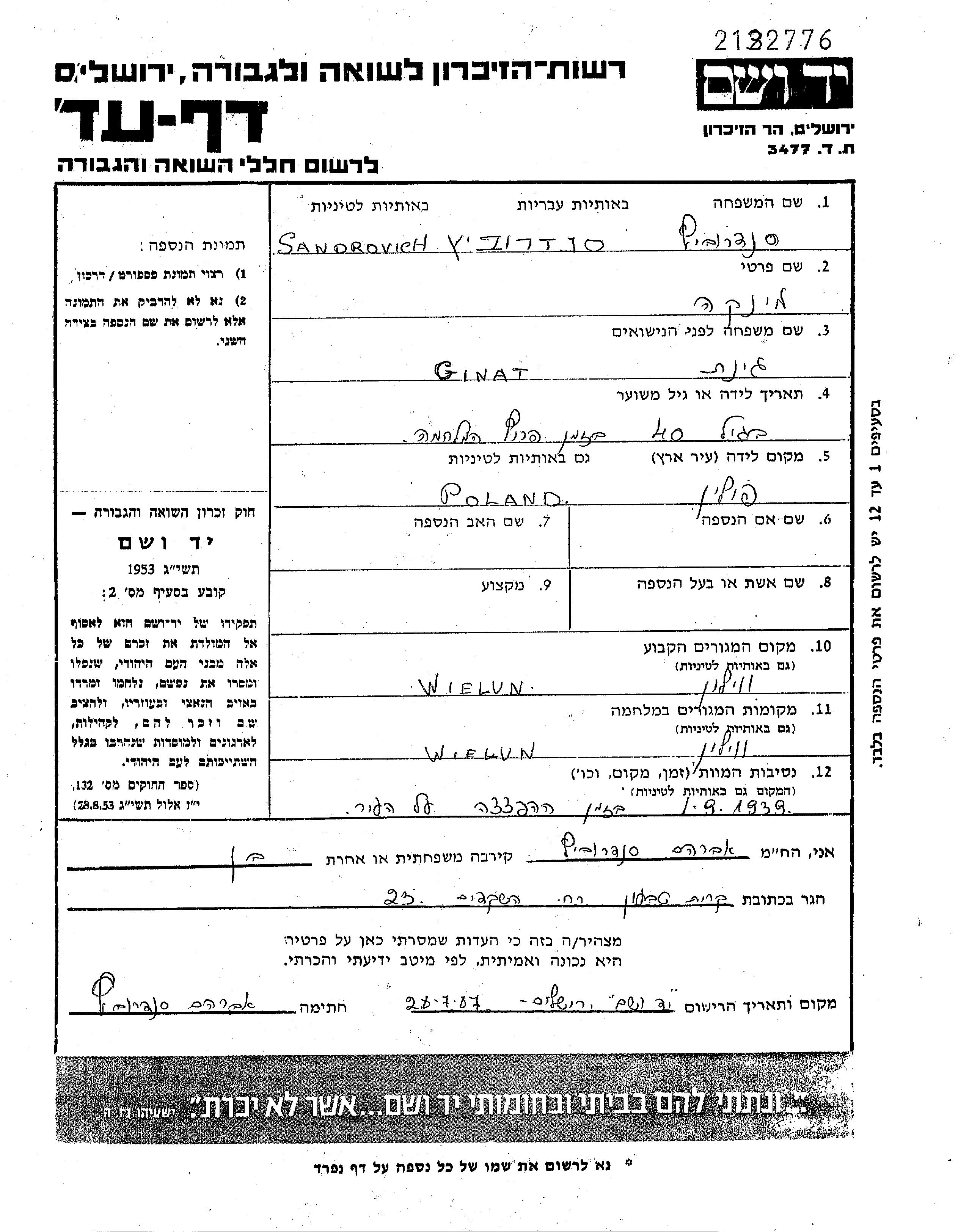 Sandrovich Minka Wielun, Pologne Feuille de témoignage