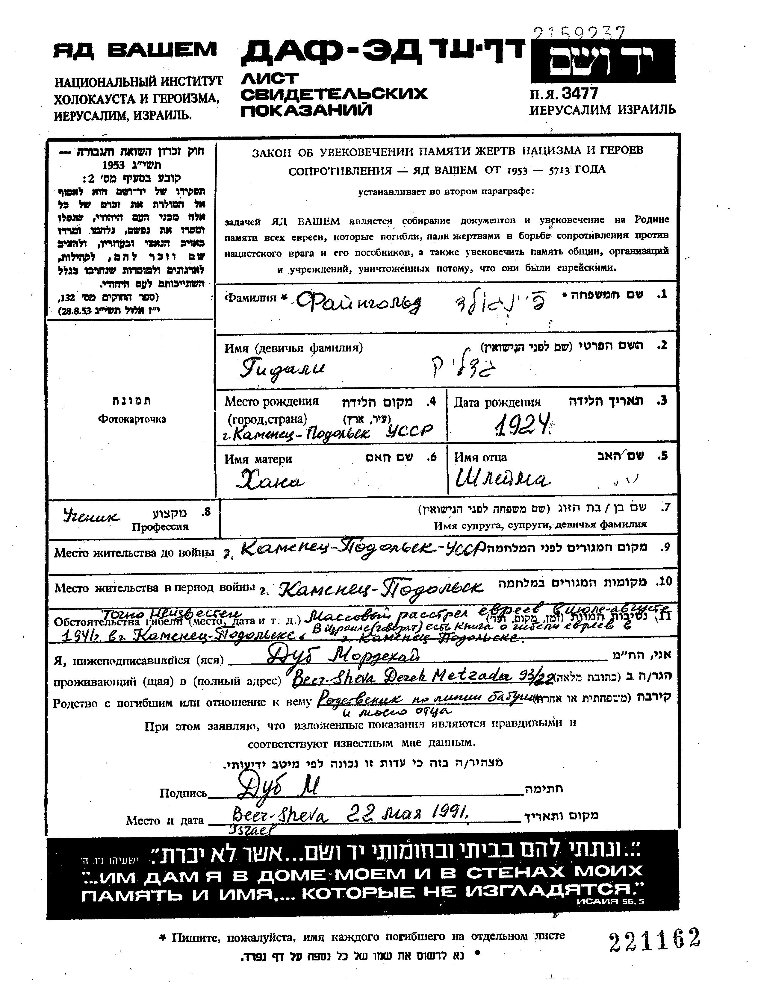 Faingold Gedalia 1924 Kamenets Podolskiy, Ukraine (URSS) Feuille de témoignage