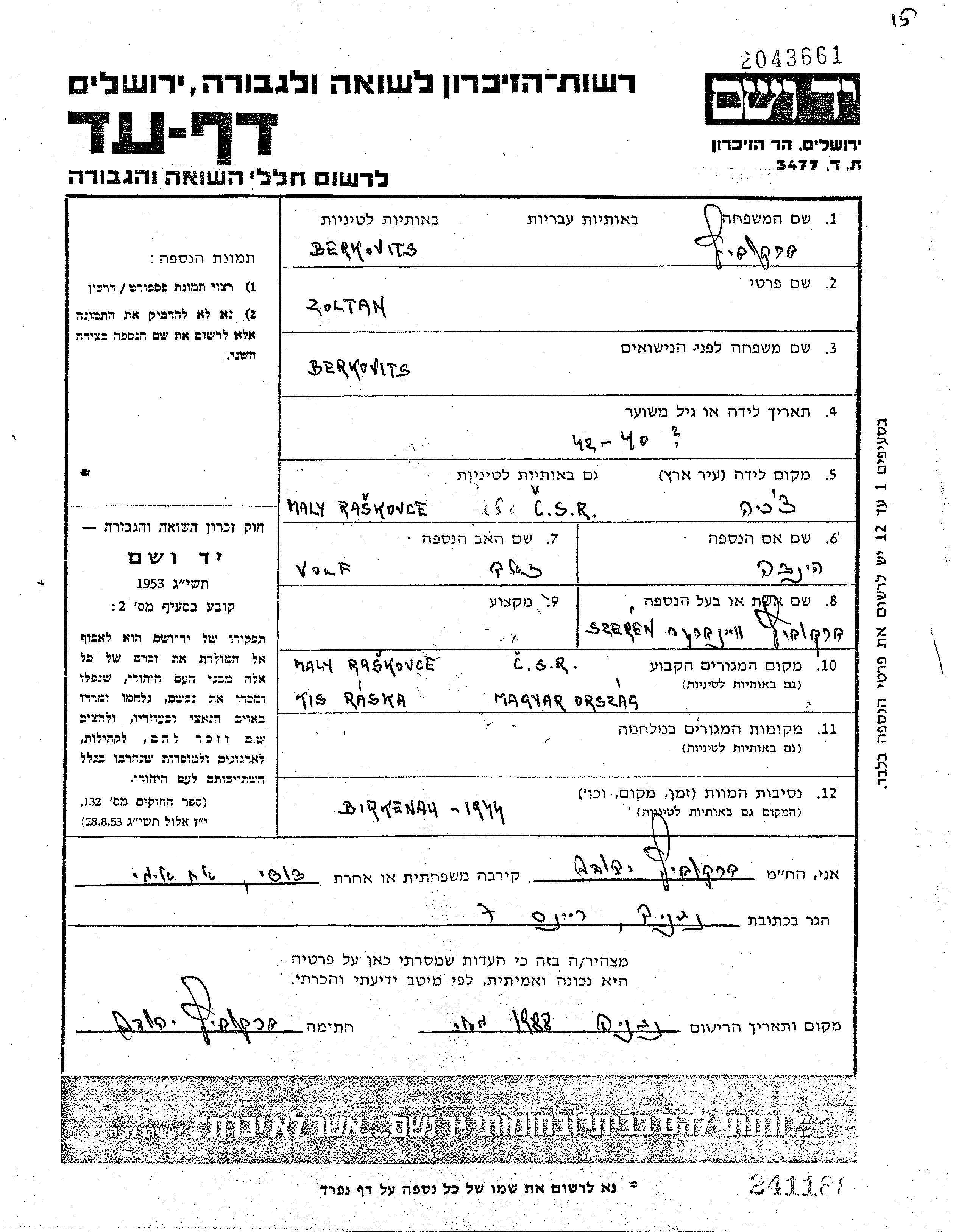 Berkovits Zoltan 1903 Male Raskovce, Tchécoslovaquie Feuille de témoignage