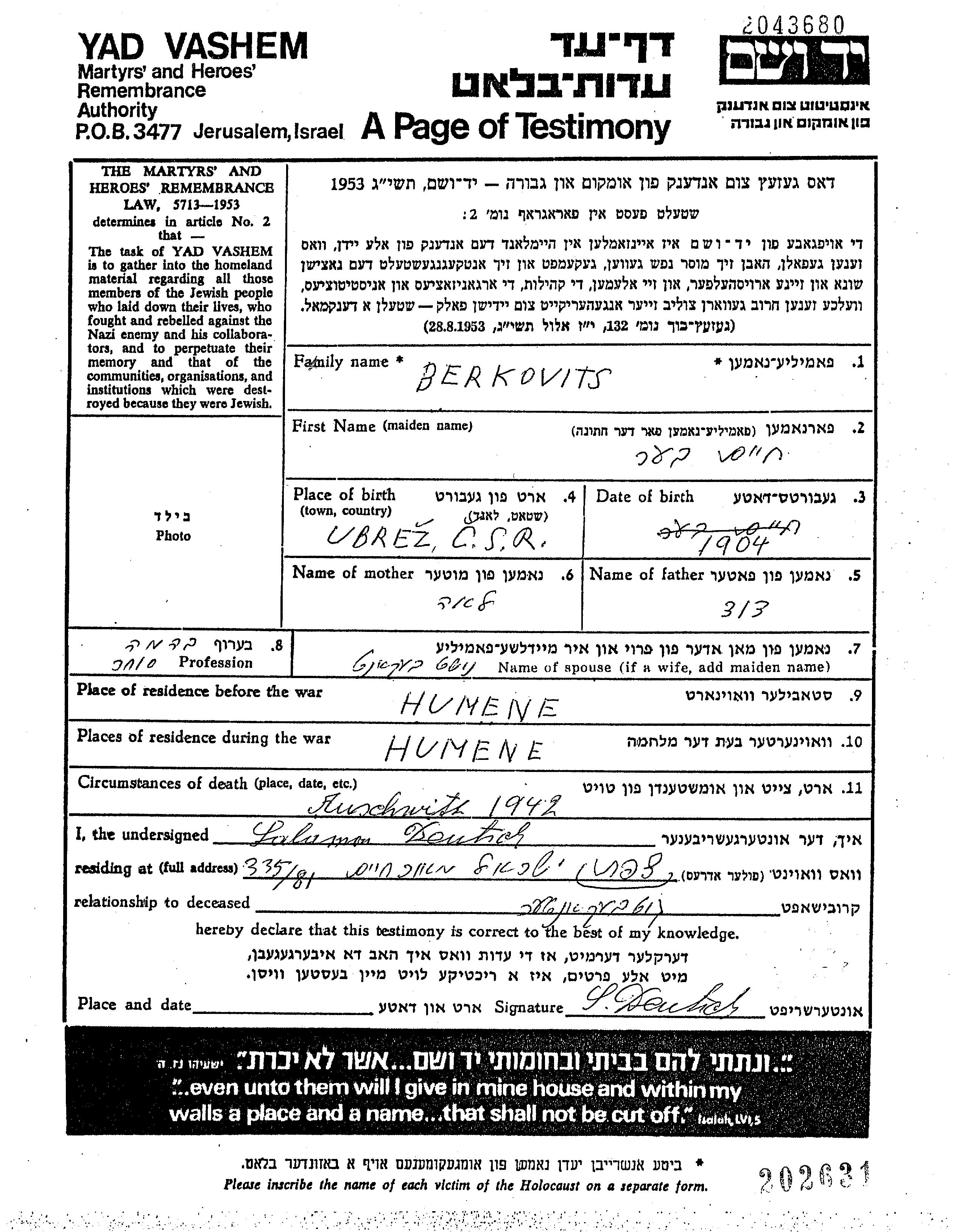Berkovits Khaim Ber 1904 Humenne, Tchécoslovaquie Feuille de témoignage