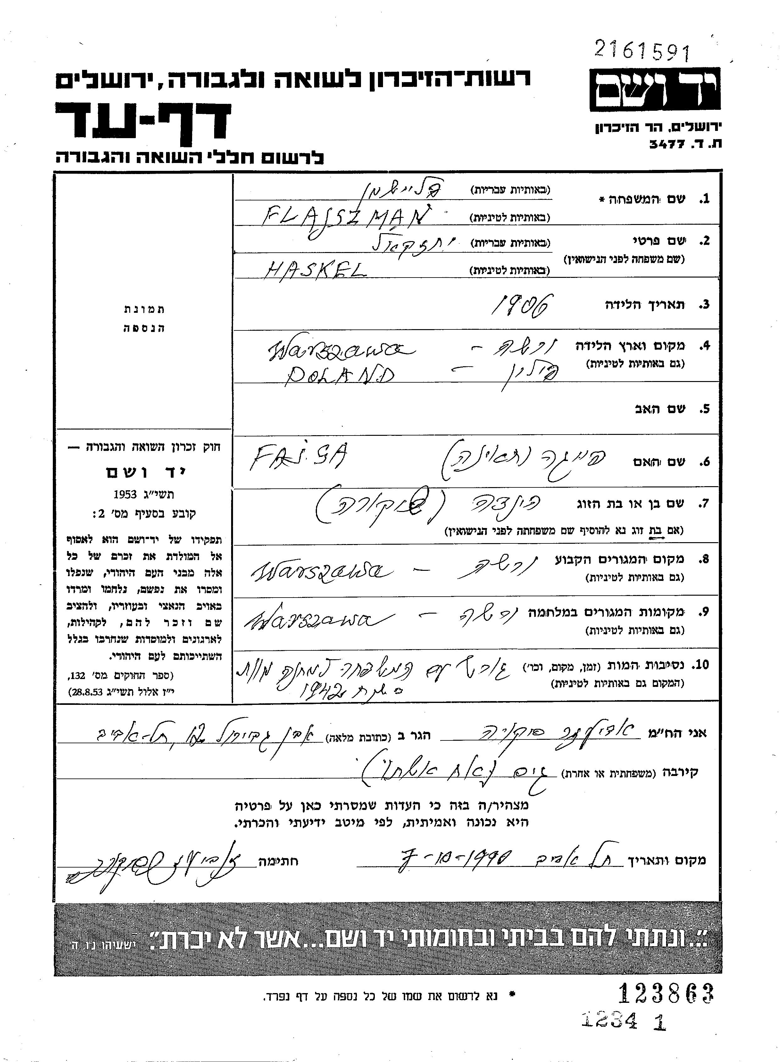 Flajszman Haskel 1906 Warszawa, Pologne Feuille de témoignage
