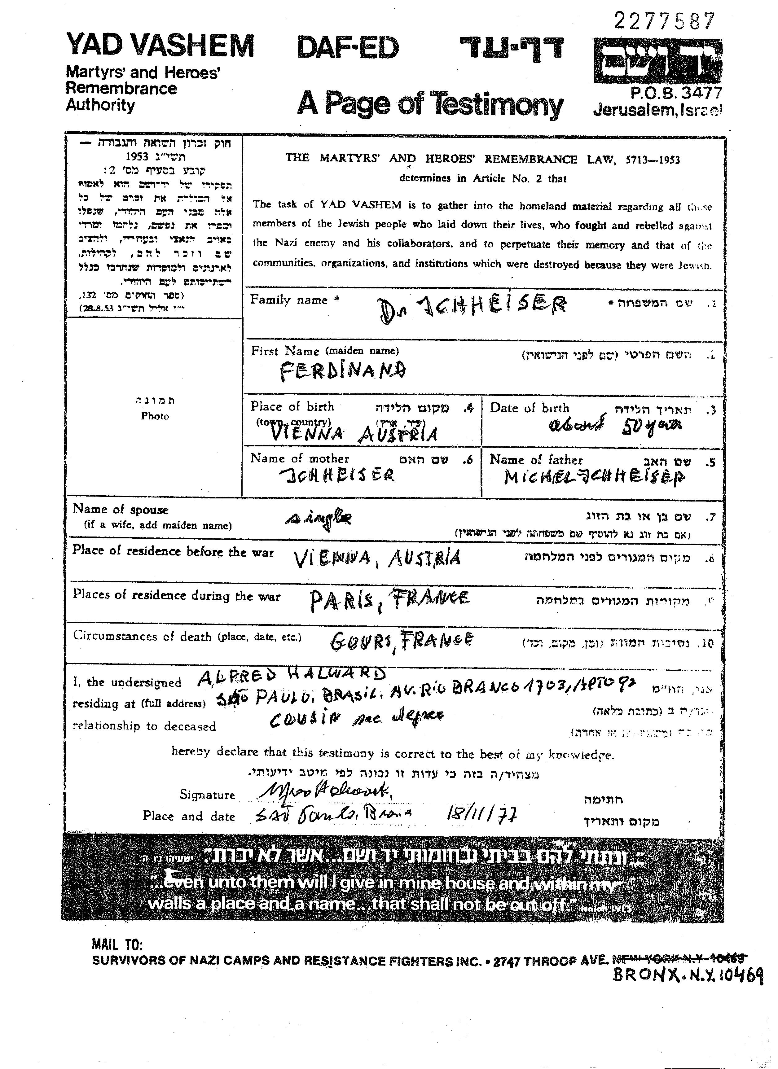Dr. Ferdinand Ichheiser est né à Wien, Autriche, fils de Michel. Il était Célibataire. Avant la seconde guerre mondiale il vivait à Wien, Autriche. Au cours de la guerre, il était à Paris, France.
