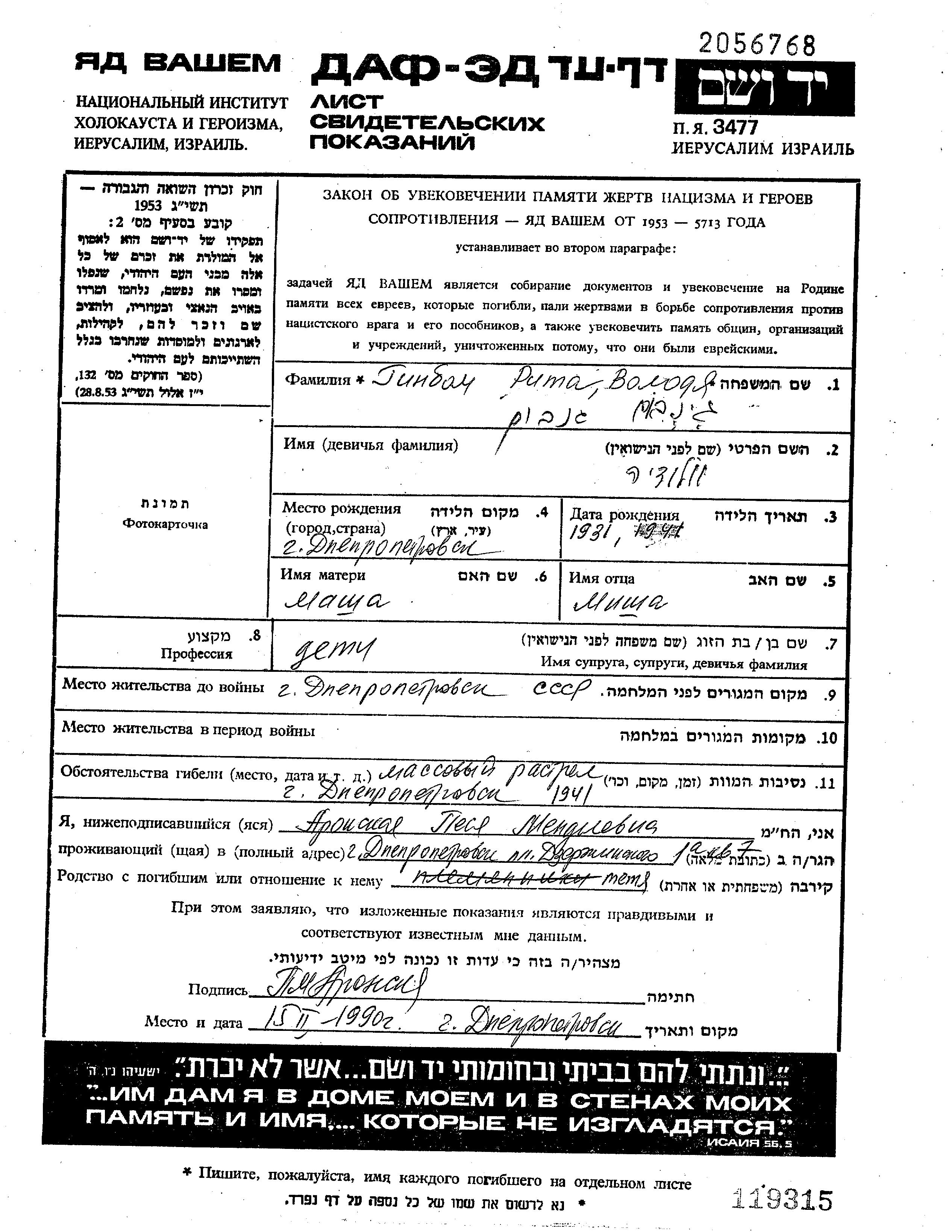 Ginbom Volodia 1941 Dnepropetrovsk, Ukraine (URSS) Feuille de témoignage