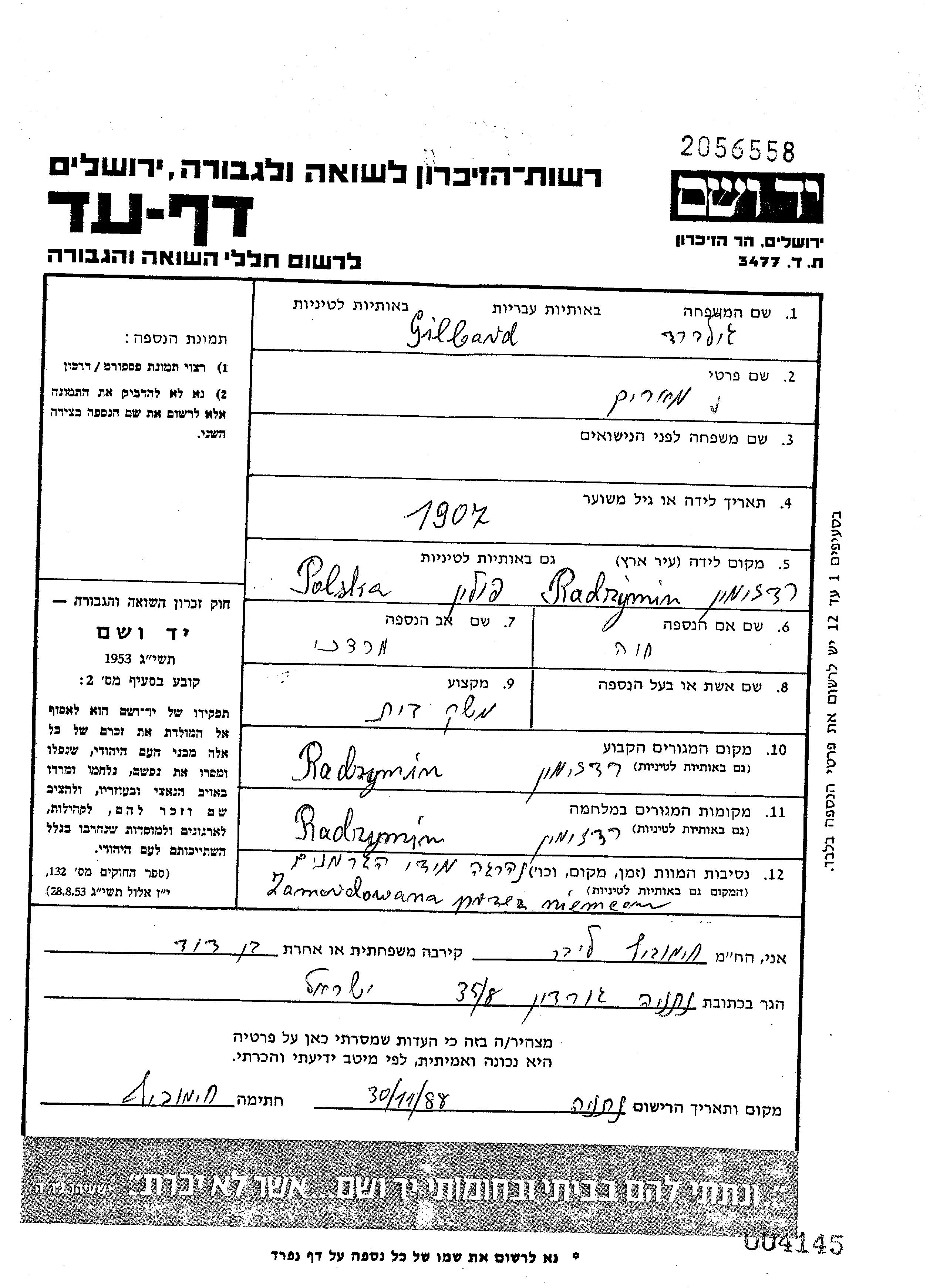 Gilbard Miriam 1907 Radzymin, Pologne Feuille de témoignage