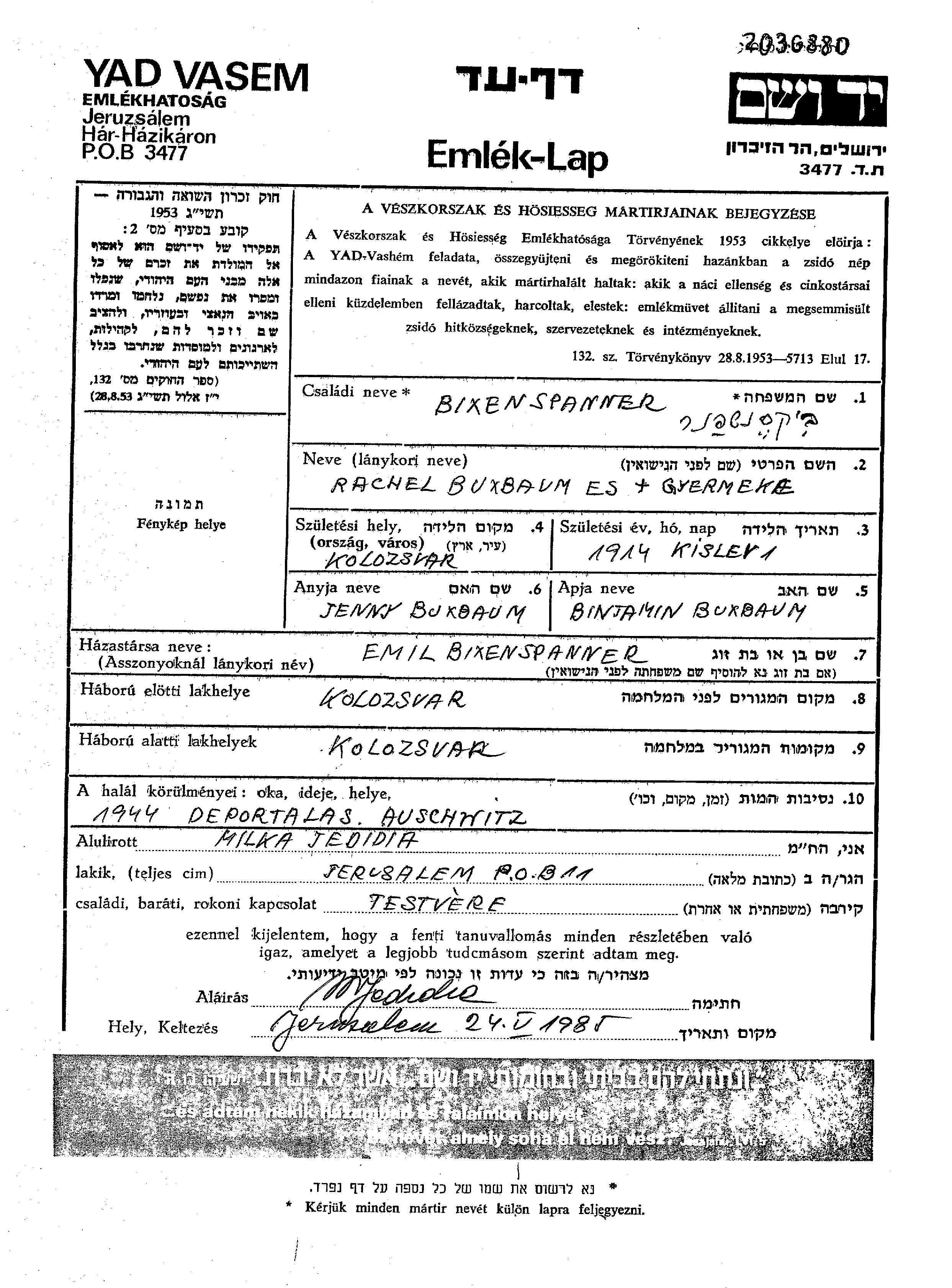 Bixenspanner Rachel 1914 Kolozsvar, Roumanie Feuille de témoignage