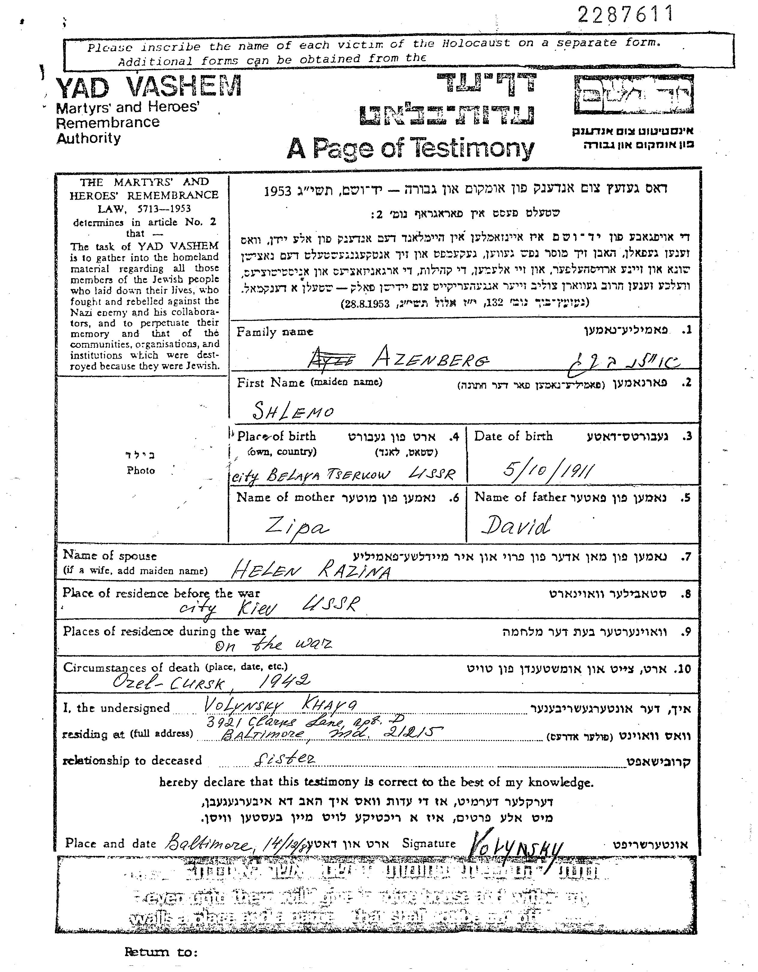 Azenberg Shlemo Dalma 1911 Kiyev, Ukraine (URSS) Feuille de témoignage