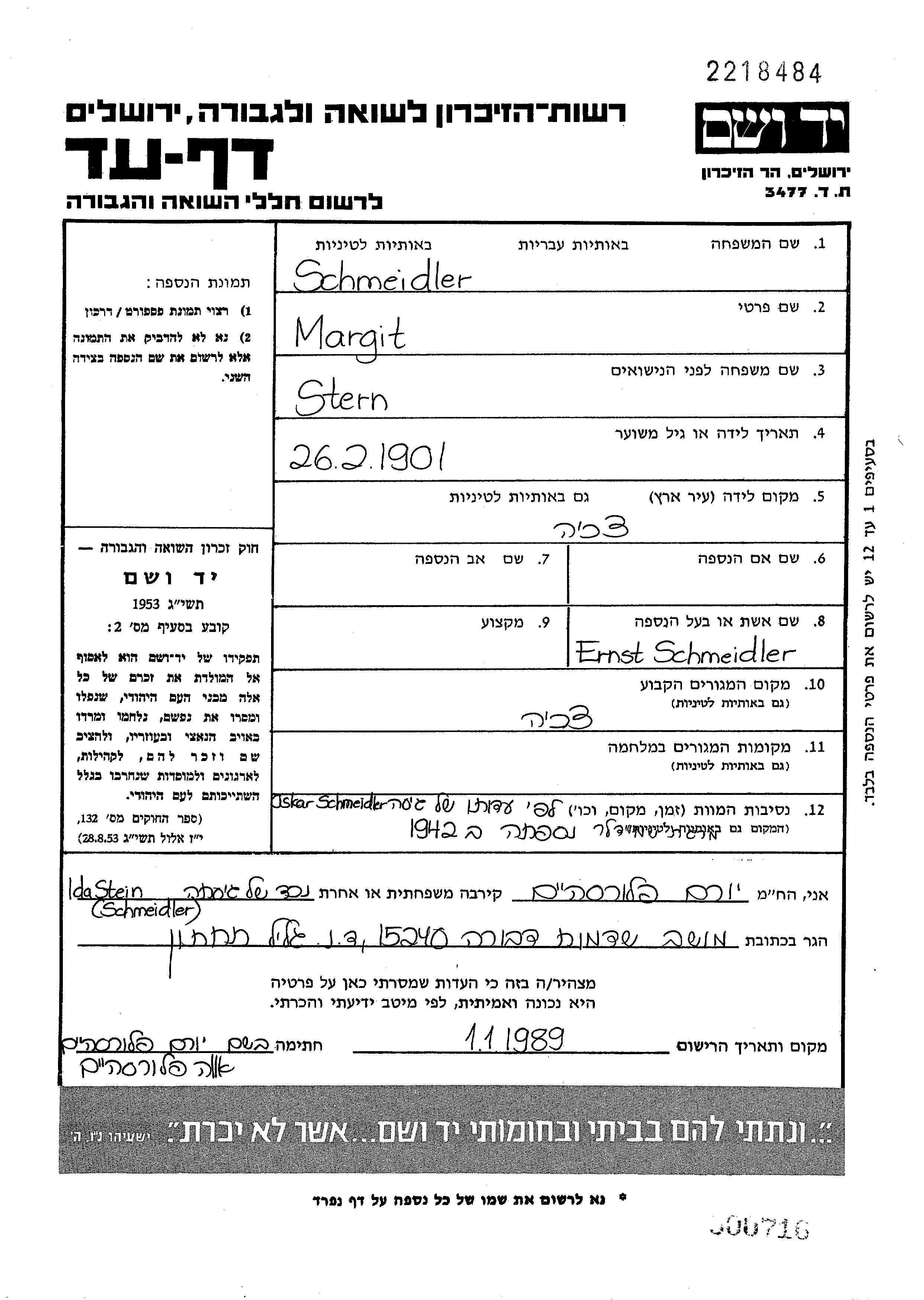 Schmeidler Margit 1901 Tchécoslovaquie Feuille de témoignage