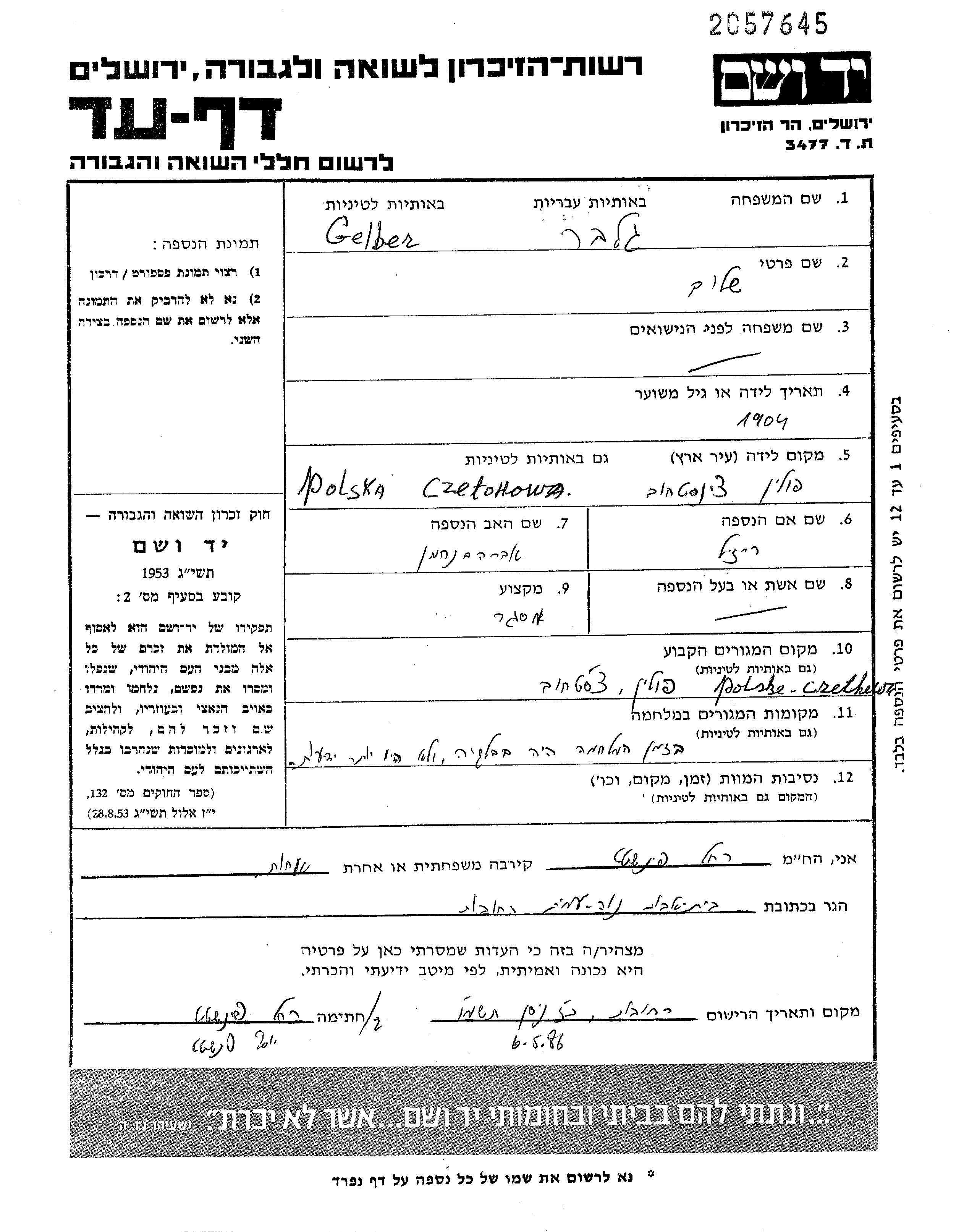 Gelber Shalom 1904 Czestochowa, Pologne Feuille de témoignage