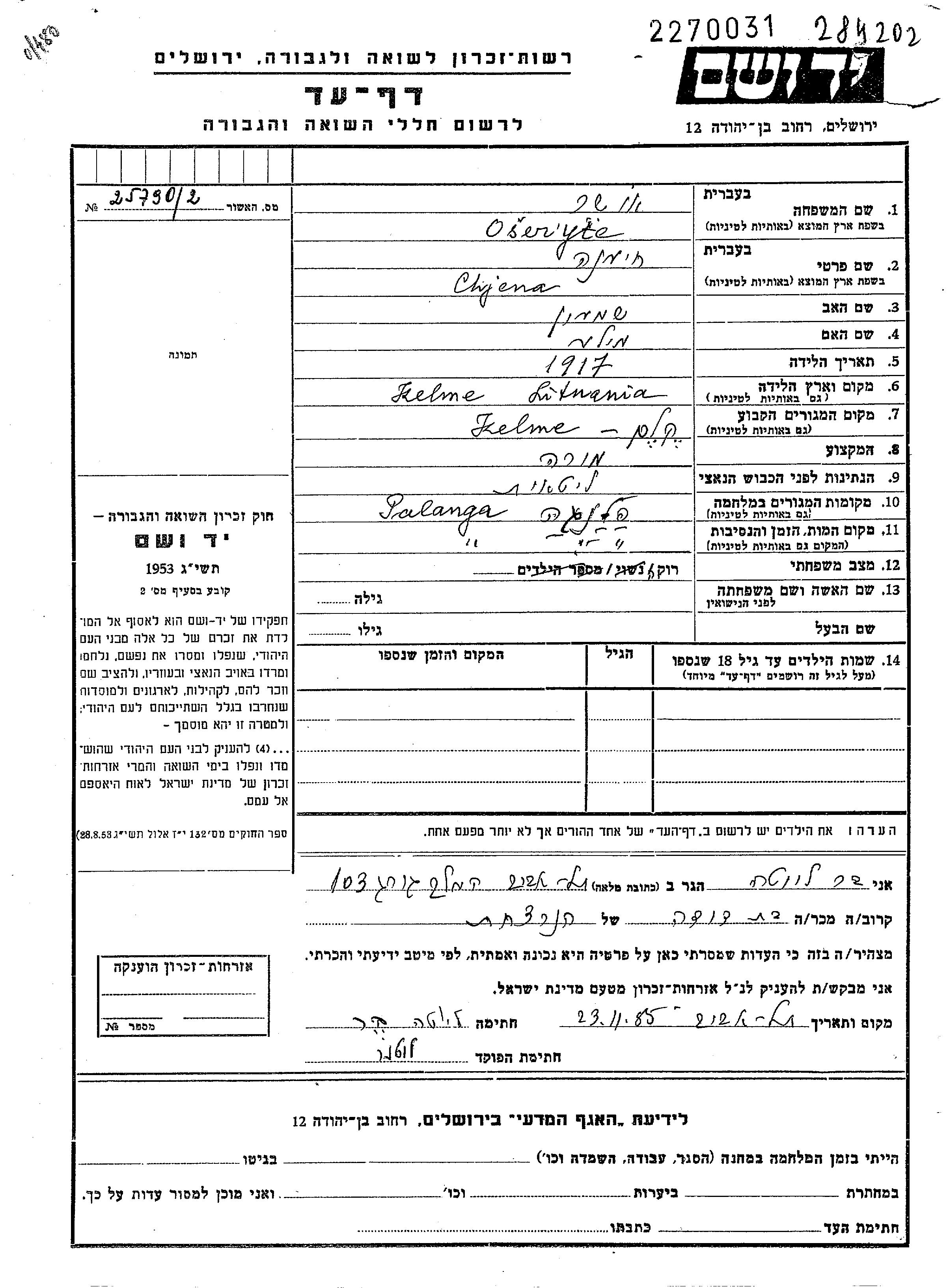 Oser Chjena 1917 Kelmė, Lituanie Feuille de témoignage