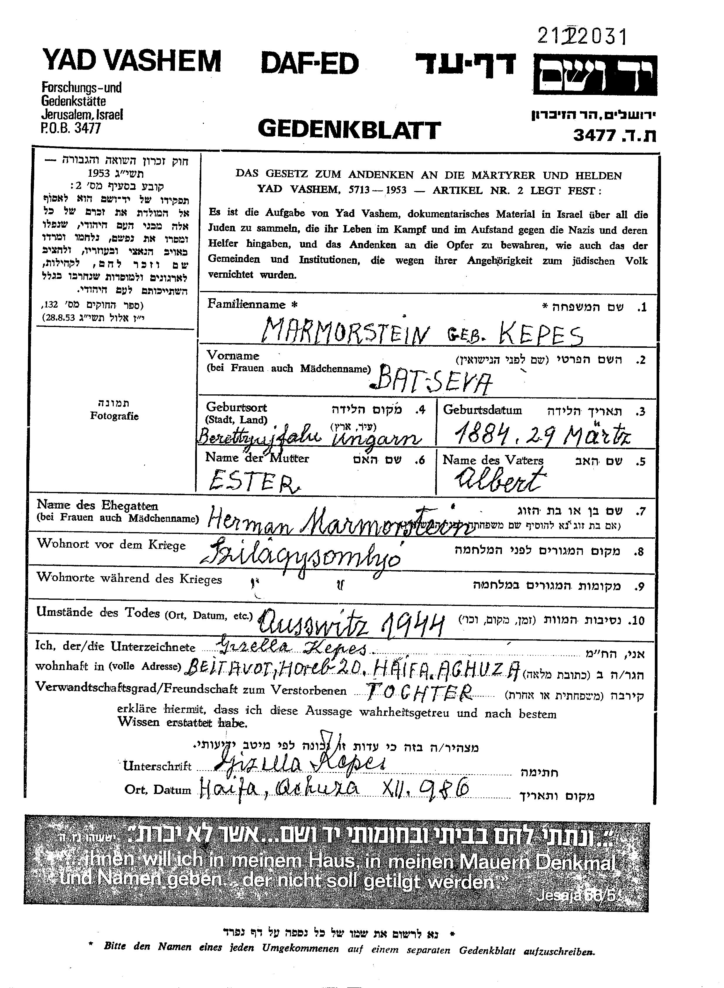 Bat Seva Marmorstein née Kepes est née à Told, Hongrie en 1884, fille de Albert et de Ester. Elle était Mariée à Herman. Avant la seconde guerre mondiale elle vivait à Szilagysomlyo, Roumanie. Pendant la guerre, elle était à Szilagysomlyo, Roumanie.
