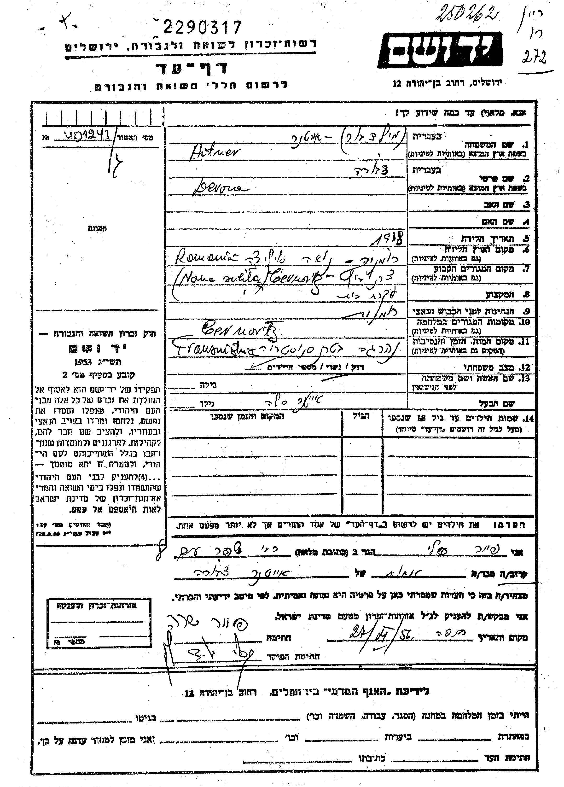 Aitner Devora 1918 Czernowitz, Roumanie Feuille de témoignage