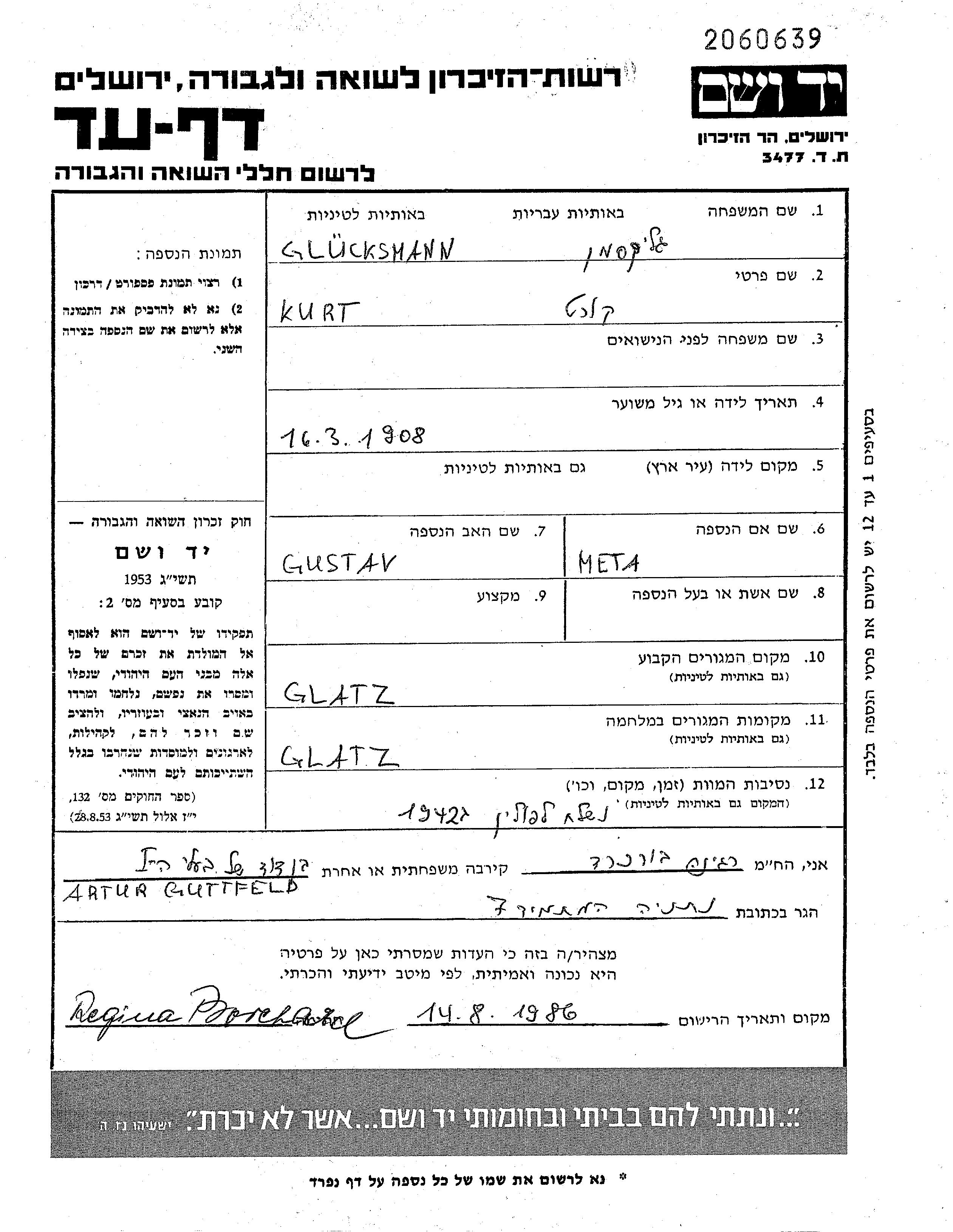 Gluecksmann Kurt 1908 Glatz, Allemagne Feuille de témoignage