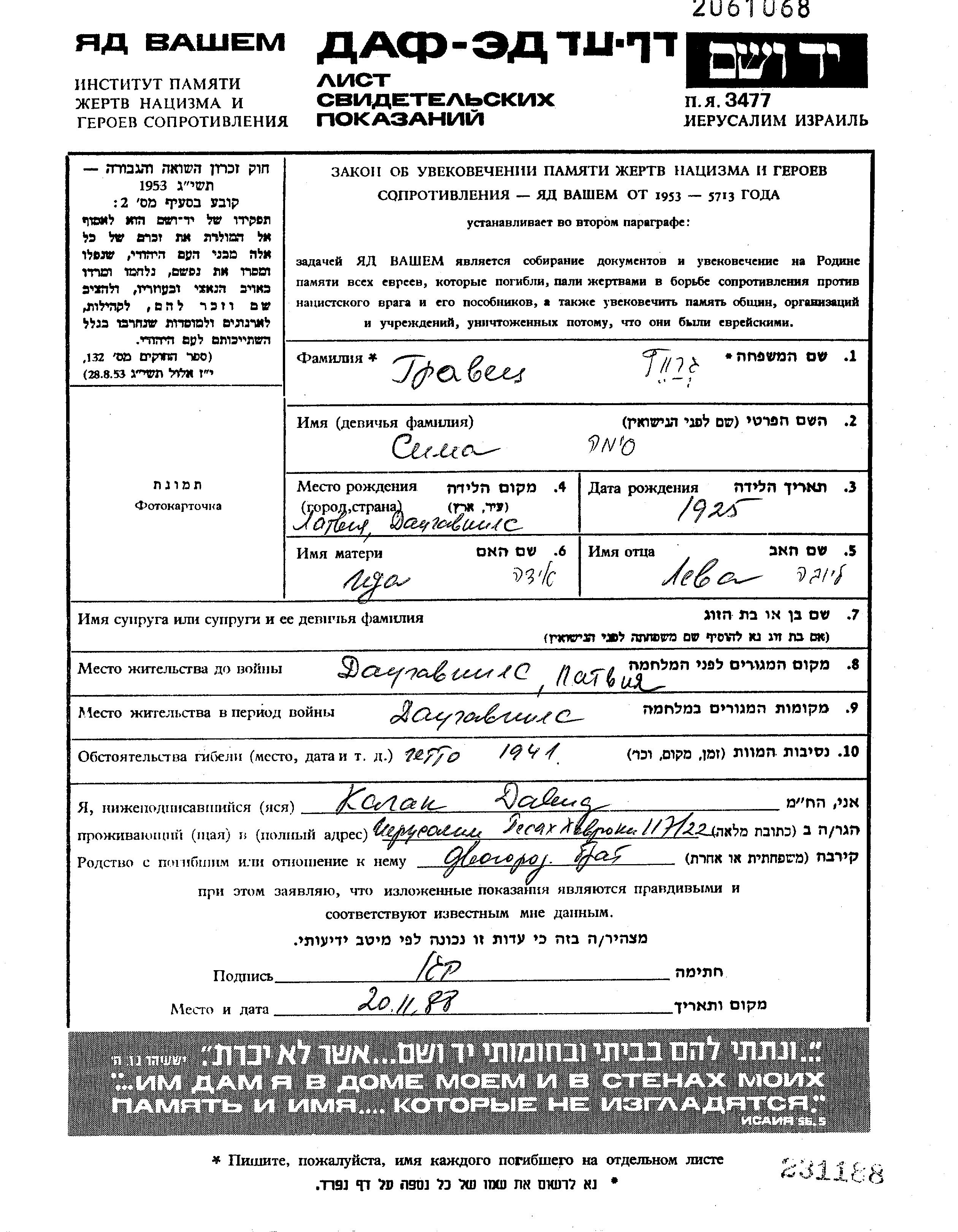 Gravetz Sima 1925 Daugavpils, Lettonie Feuille de témoignage