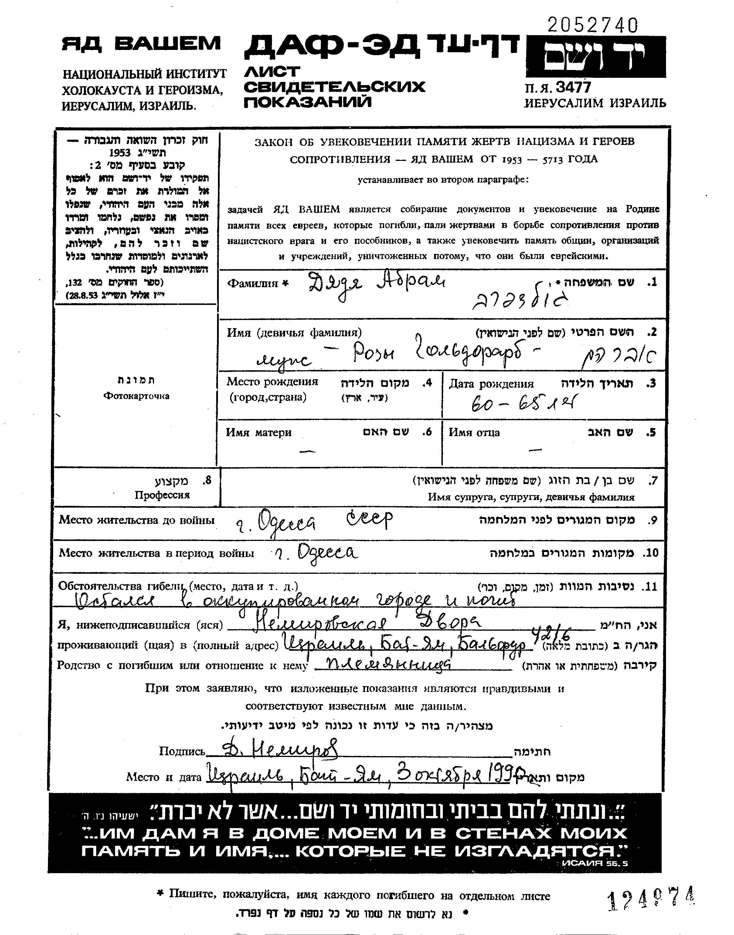Abram a été assassiné pendant la Shoah. Lieu de la mort: Odessa, Ukraine (URSS).