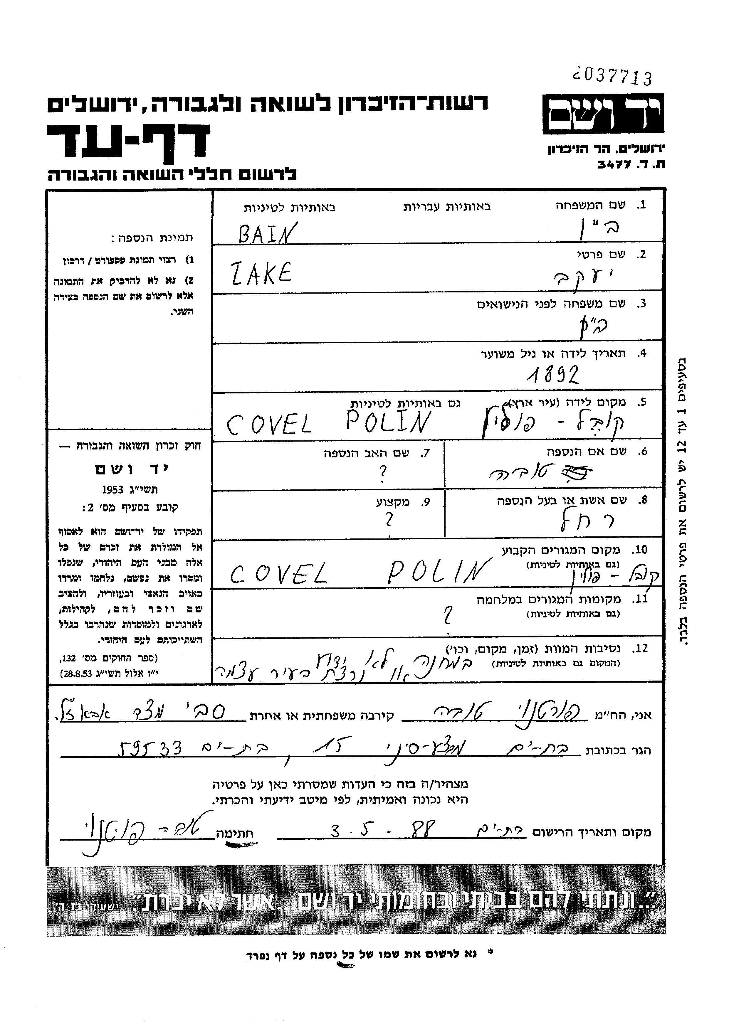 Jake Bain est né à Kowel, Pologne en 1892, fils de Tova. Il était Mariée à Rakhel. Avant la seconde guerre mondiale il vivait à Kowel, Pologne.