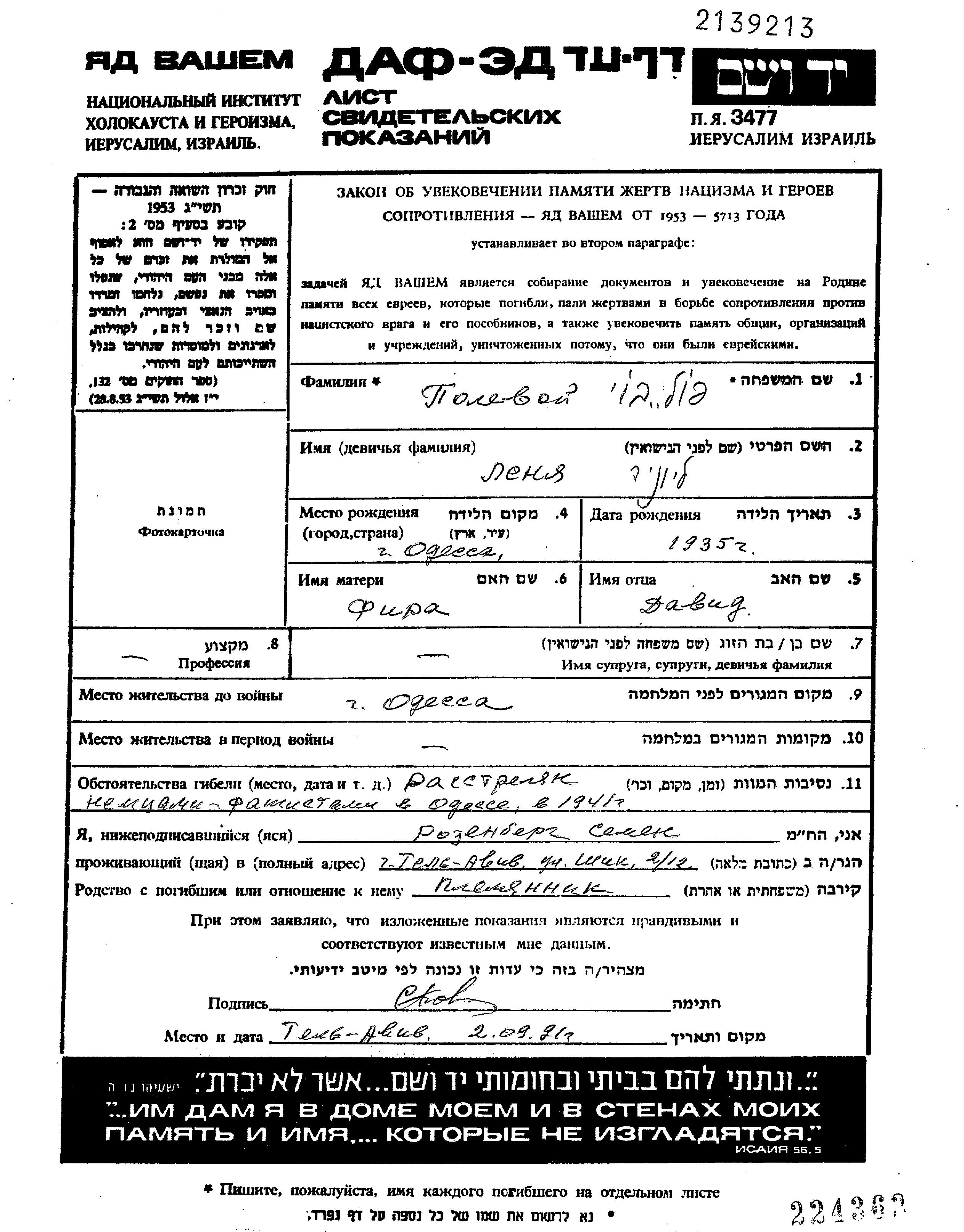 Lyonya Polevoi est né à Odessa, Ukraine (URSS), fils de David et de Fira née Rozenberg. Il était Enfant. Avant la seconde guerre mondiale il vivait à Odessa, Ukraine (URSS). Au cours de la guerre, il était à Odessa, Ukraine (URSS).