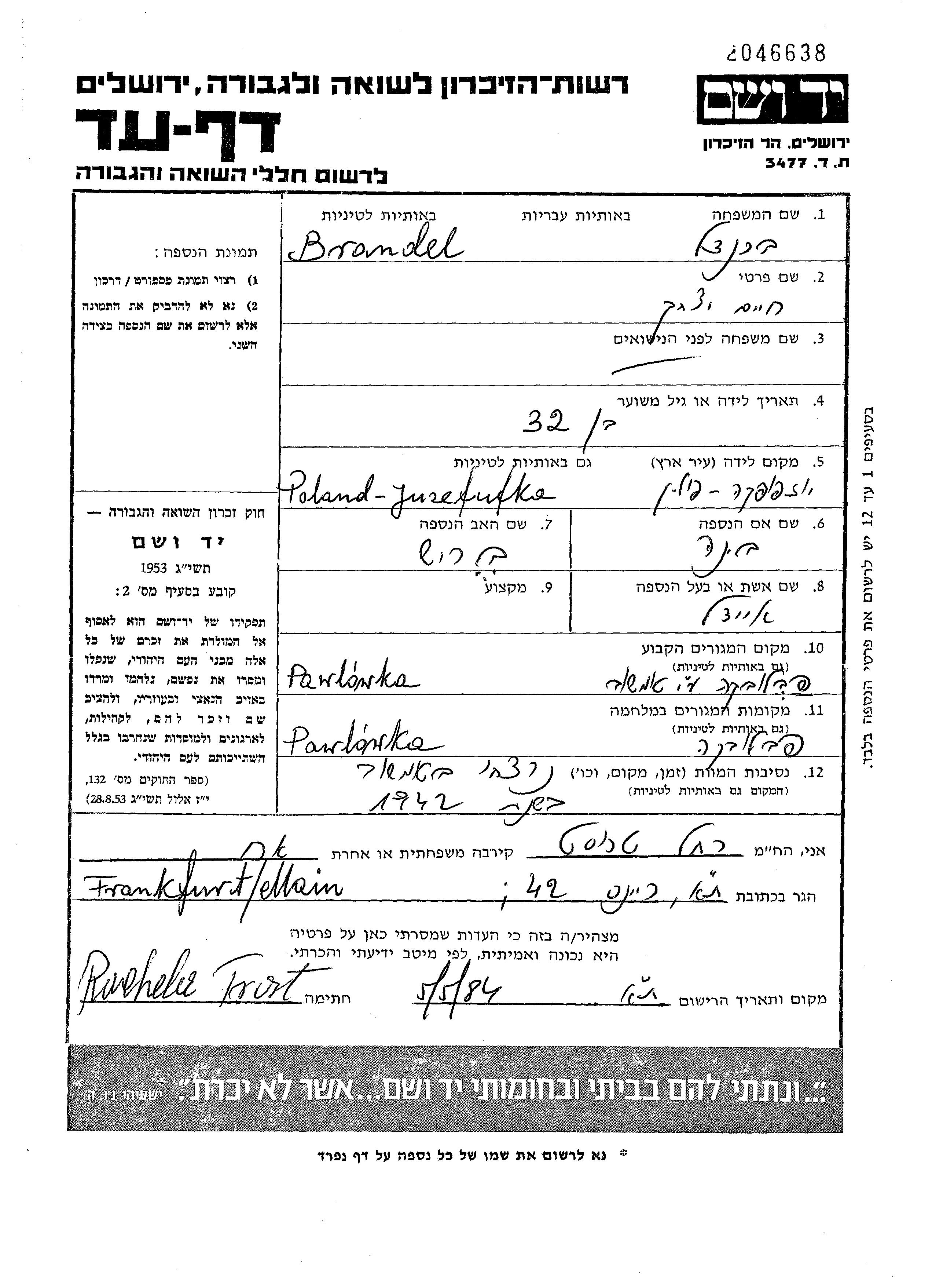 Brandel Ytzkhak Khaim Pawlowka, Pologne Feuille de témoignage