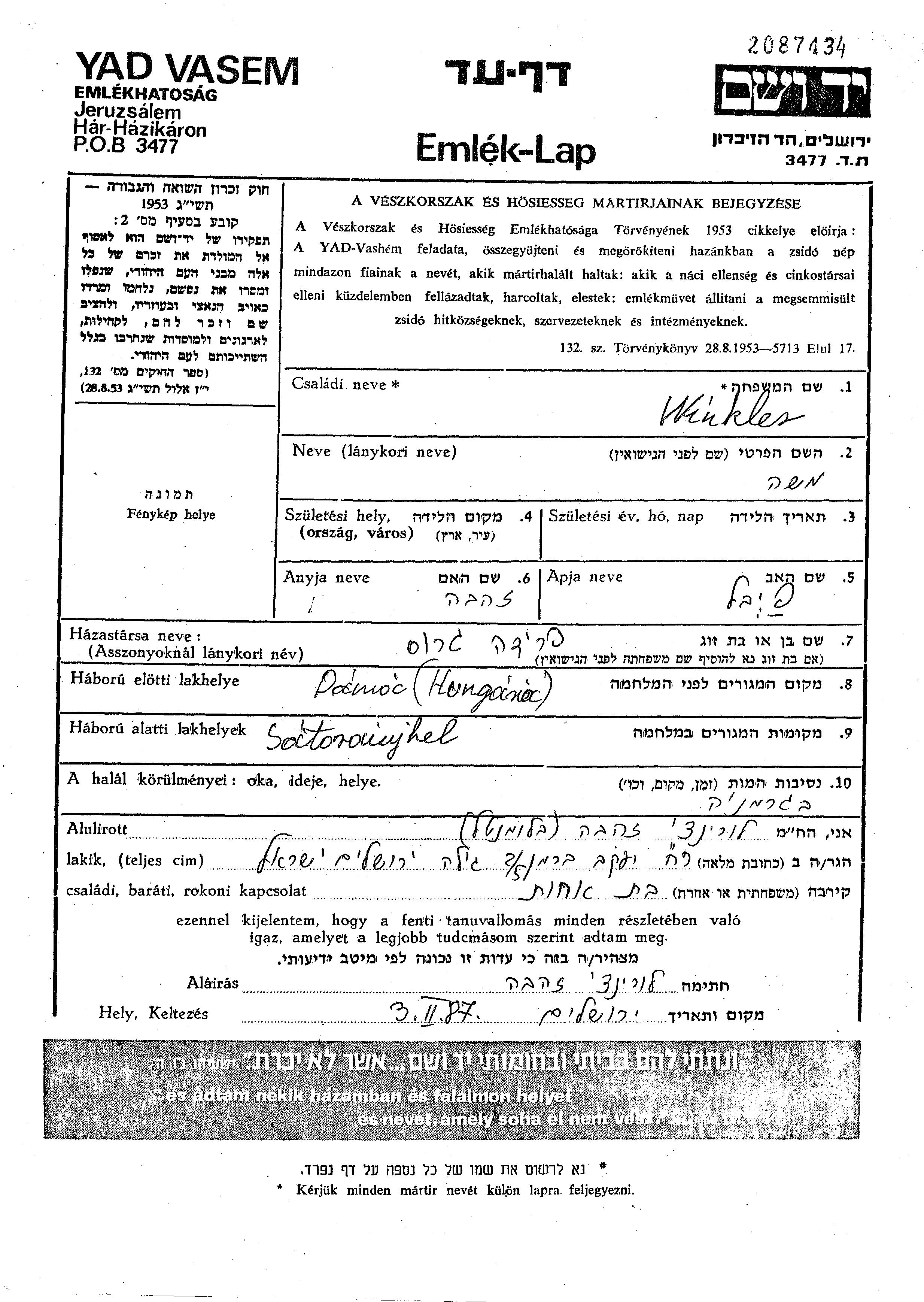 Winkler Moshe Damoc, Hongrie Feuille de témoignage