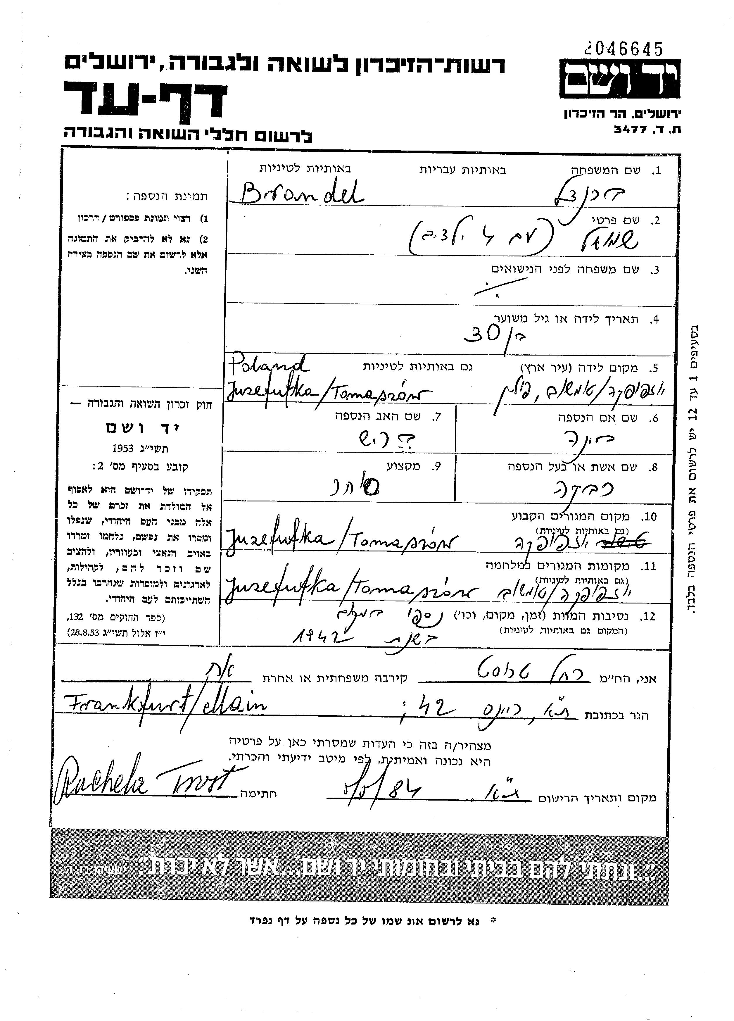 Brandel Shmuel Jozefowka, Pologne Feuille de témoignage