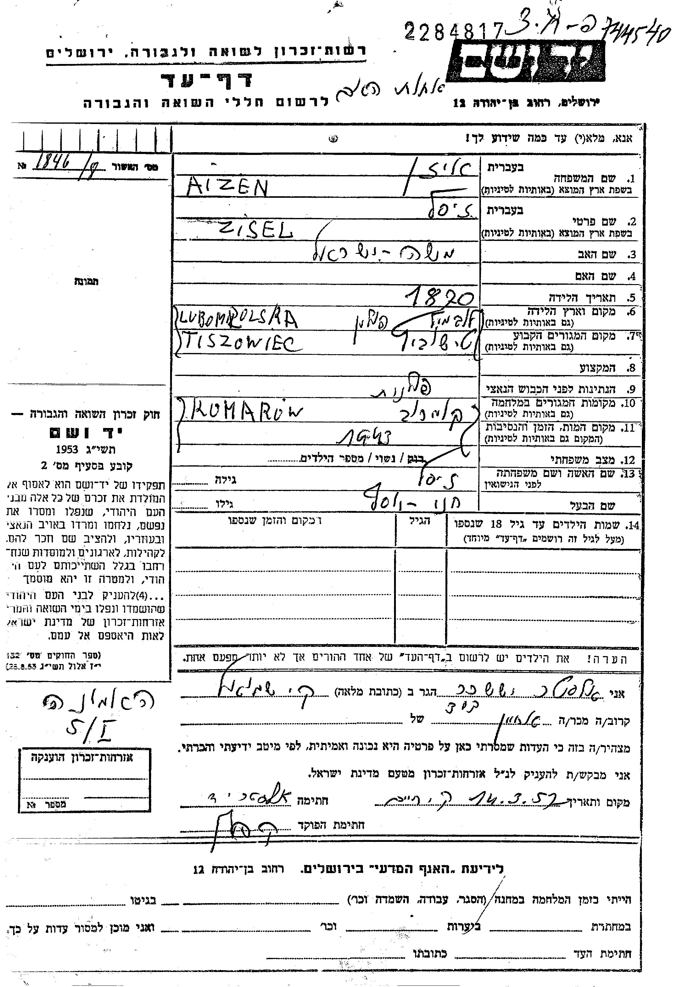 Zisel Aizen est née à Luboml, Pologne en 1870, fille de Moshe Israel. Elle était Mariée à Khani Yosef. Avant la seconde guerre mondiale elle vivait à Tyszowce, Pologne. Pendant la guerre, elle était à Komarow, Pologne.