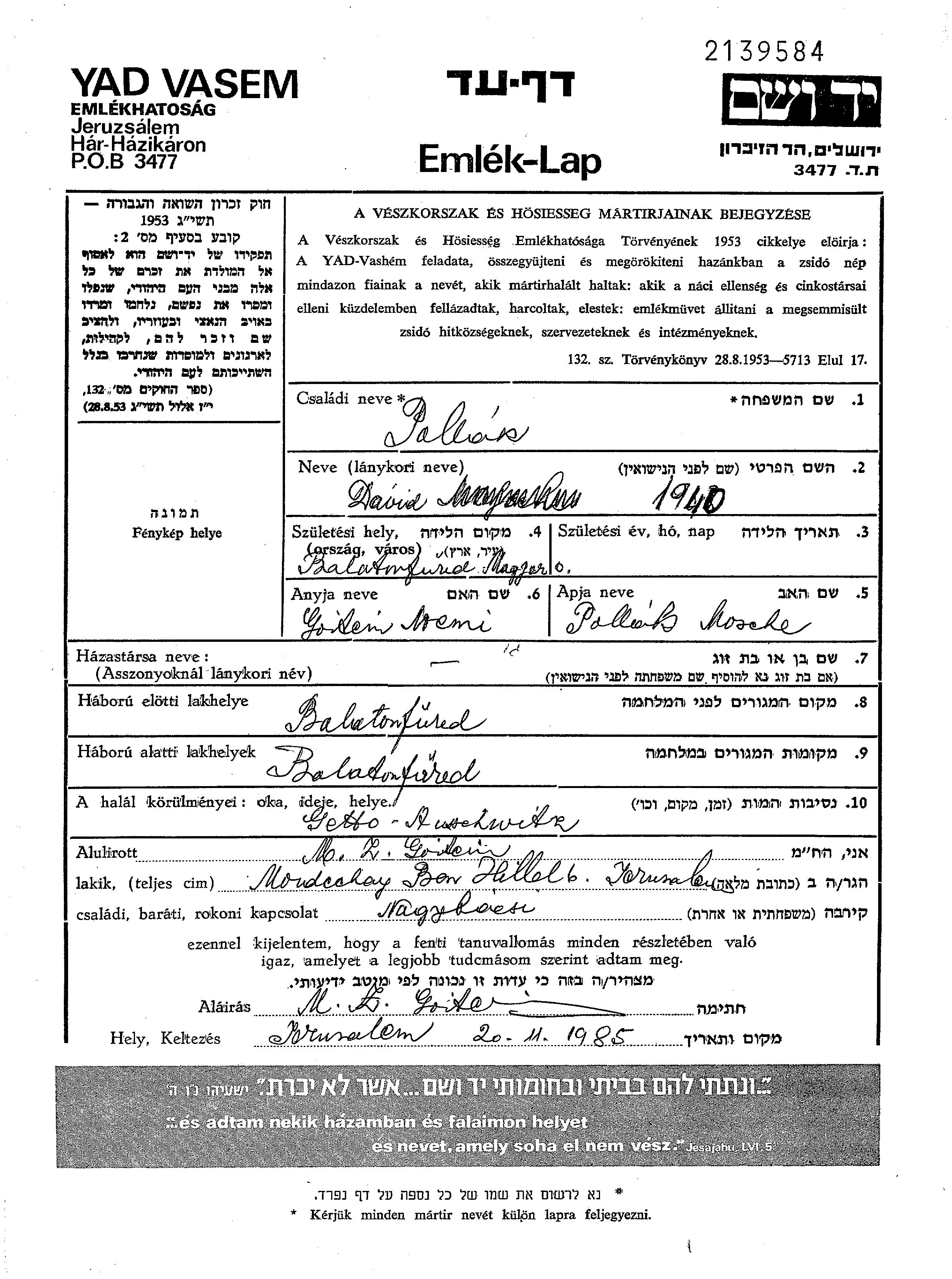 Pollak David Balatonfured, Hongrie Feuille de témoignage