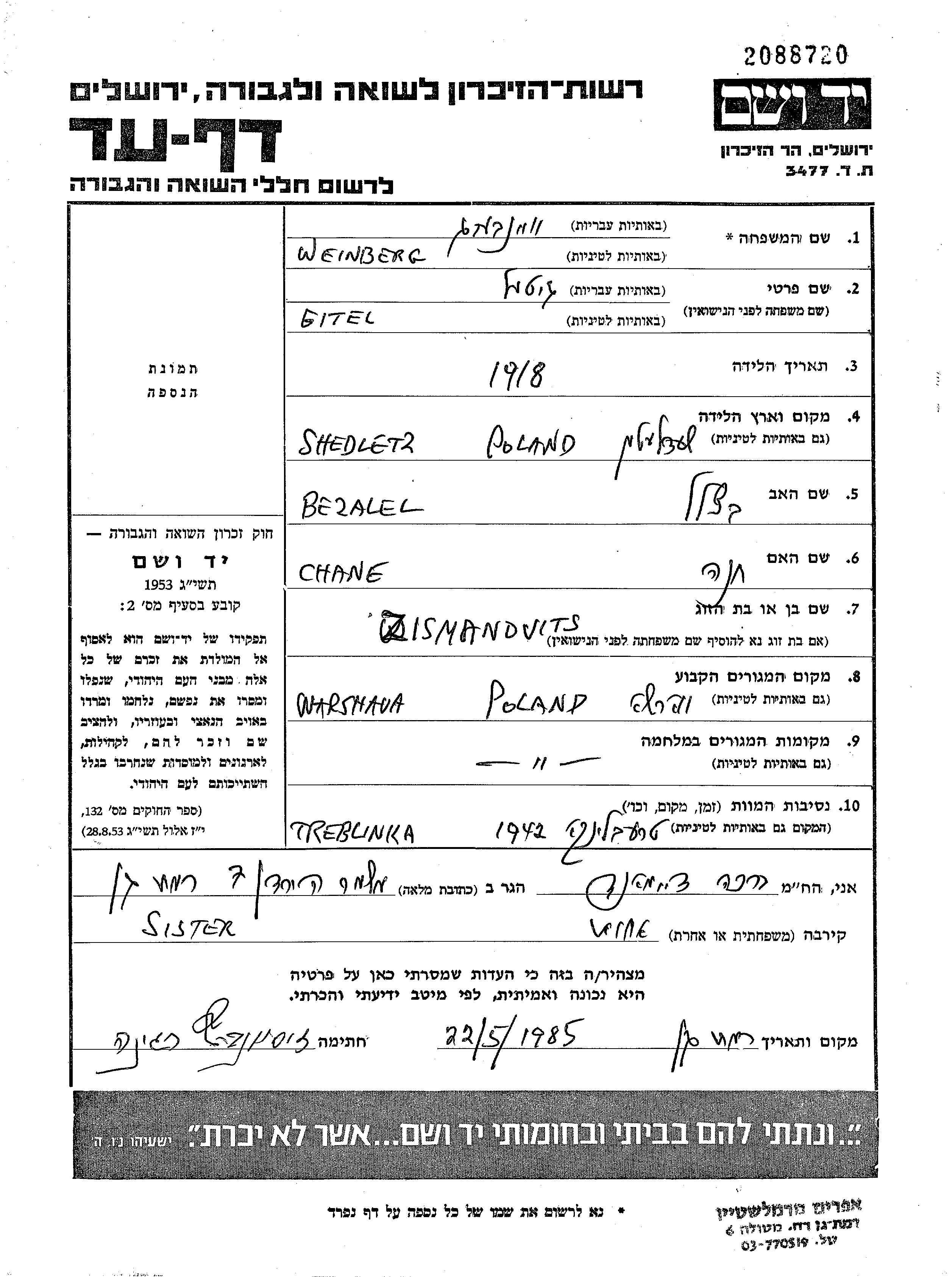 Gitel Weinberg née Zismanovits est née à Siedlce, Pologne en 1918, fille de Bezalel et de Chane. Avant la seconde guerre mondiale elle vivait à Warszawa, Pologne. Pendant la guerre, elle était à Warszawa, Pologne.